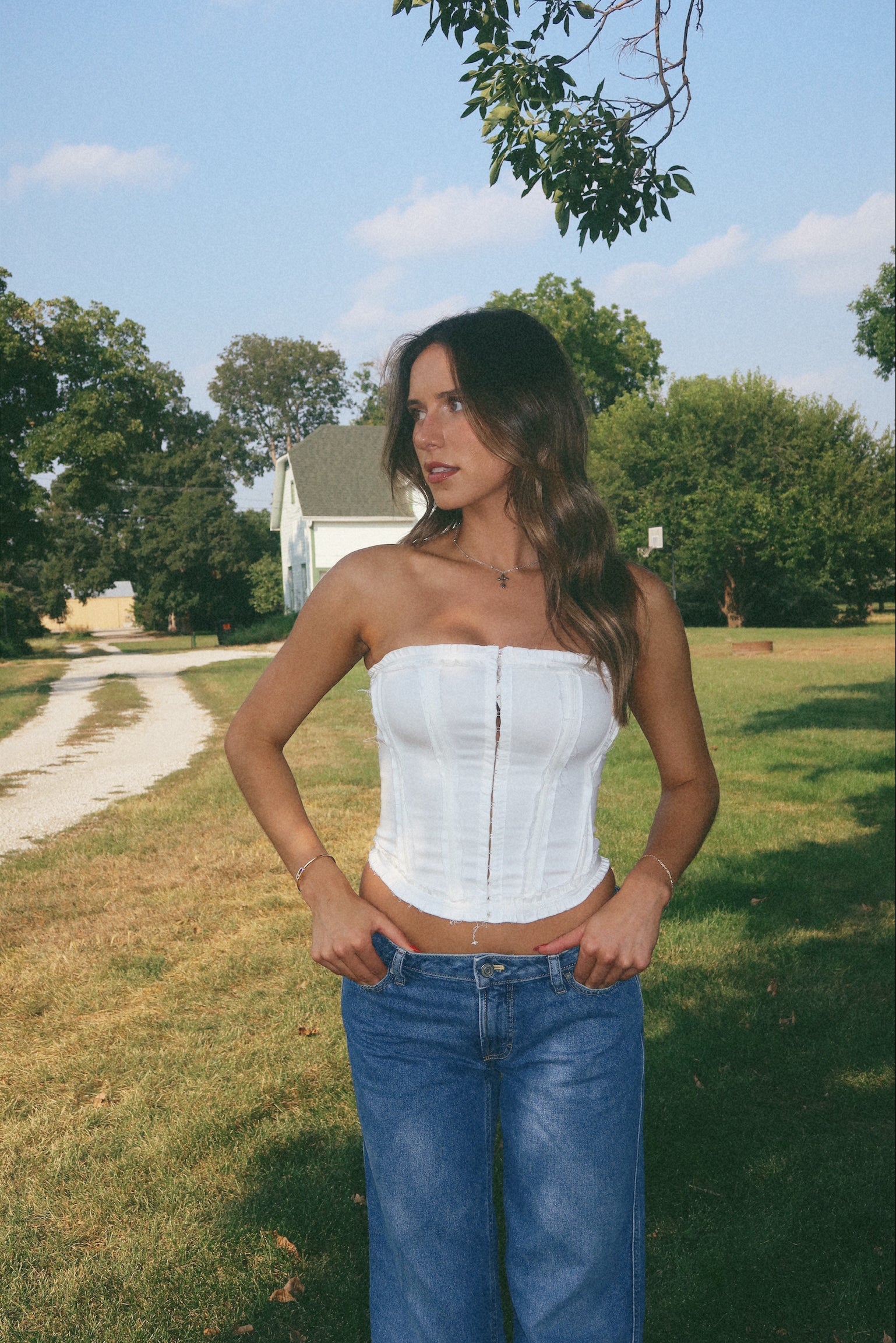 OurKinsey Corset Top is a strapless corset top that features unique distressed raw hem and seam detailing throughout the bodice. This top features a hook and eye closure down the center of the bodice, fitted bodice with boning throughout, and straight across neckline. This top is made out of a lightweight material has some stretch throughout. This top has some stretch so if in between sizes we recommend sizing up.