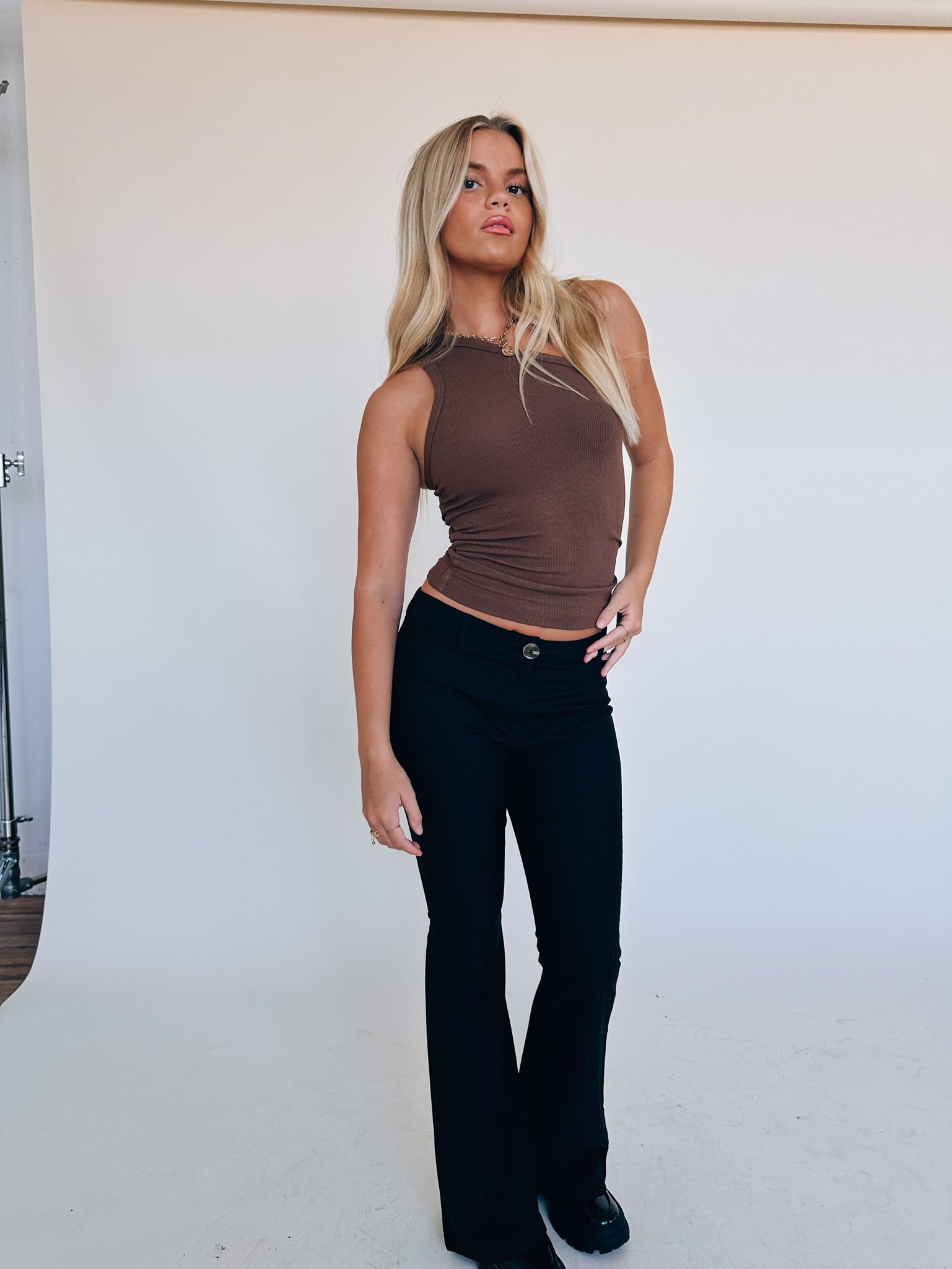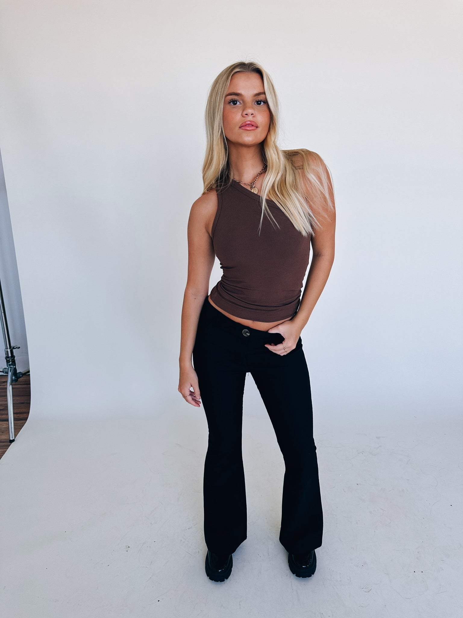 Our Zada One Shoulder Tank is a soft ribbed tank. This top features an asymmetrical neckline with the one shoulder detail. This top has fine ribbing throughout and has a ton of stretch. This top runs true to size.
