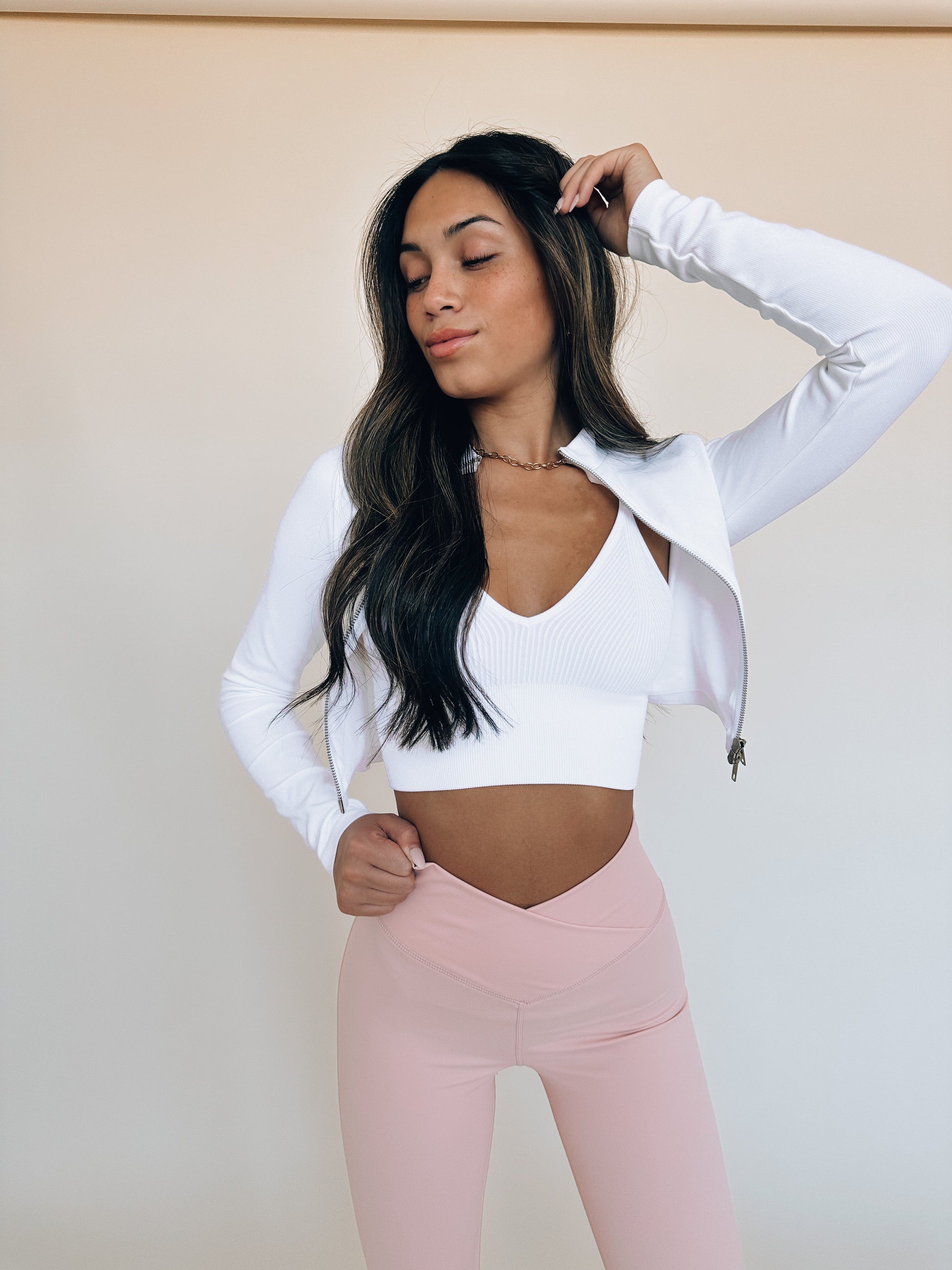 Our Brooks Front Zipper Crop In White has a fitted ribbed fabric. This long sleeved top has a front zipper closure with a two zipper feature. The sizing of this item is S/M & M/L.