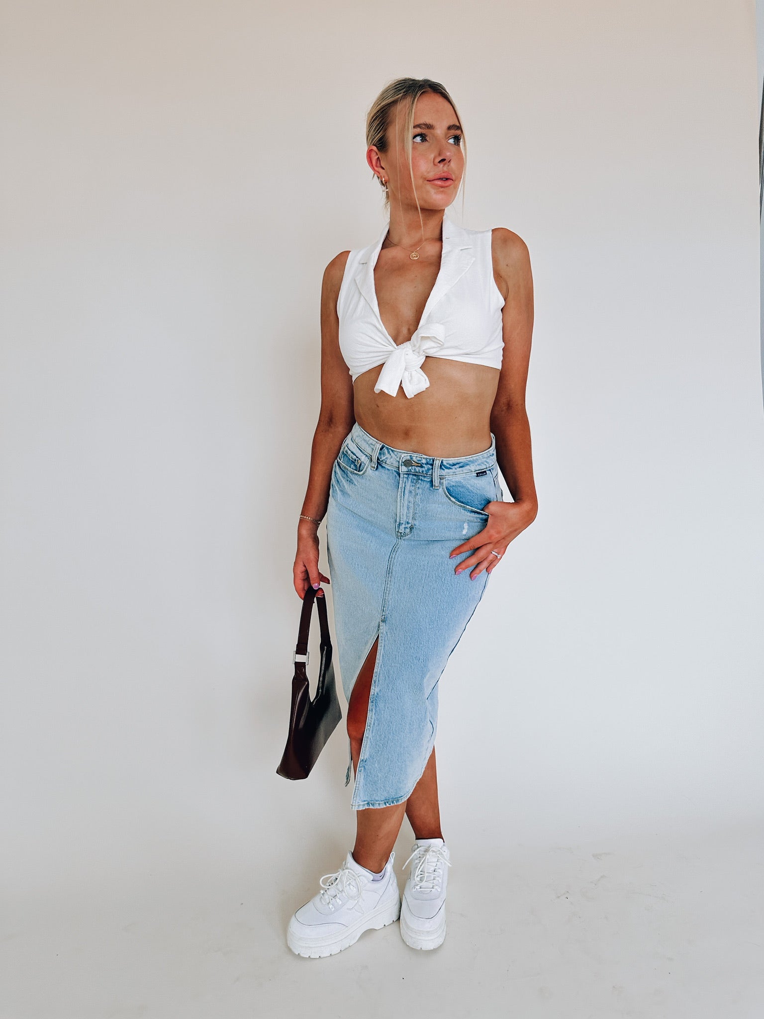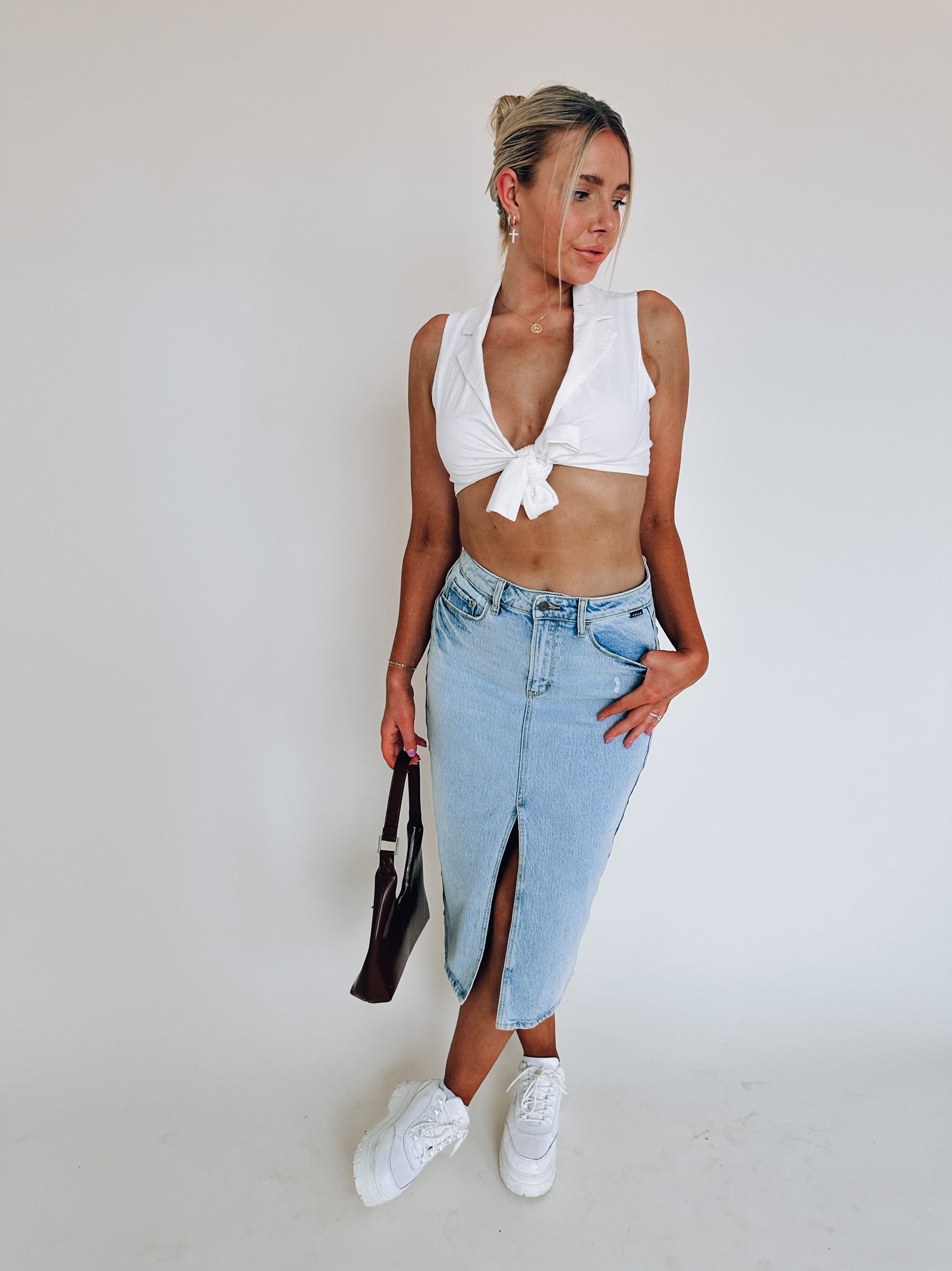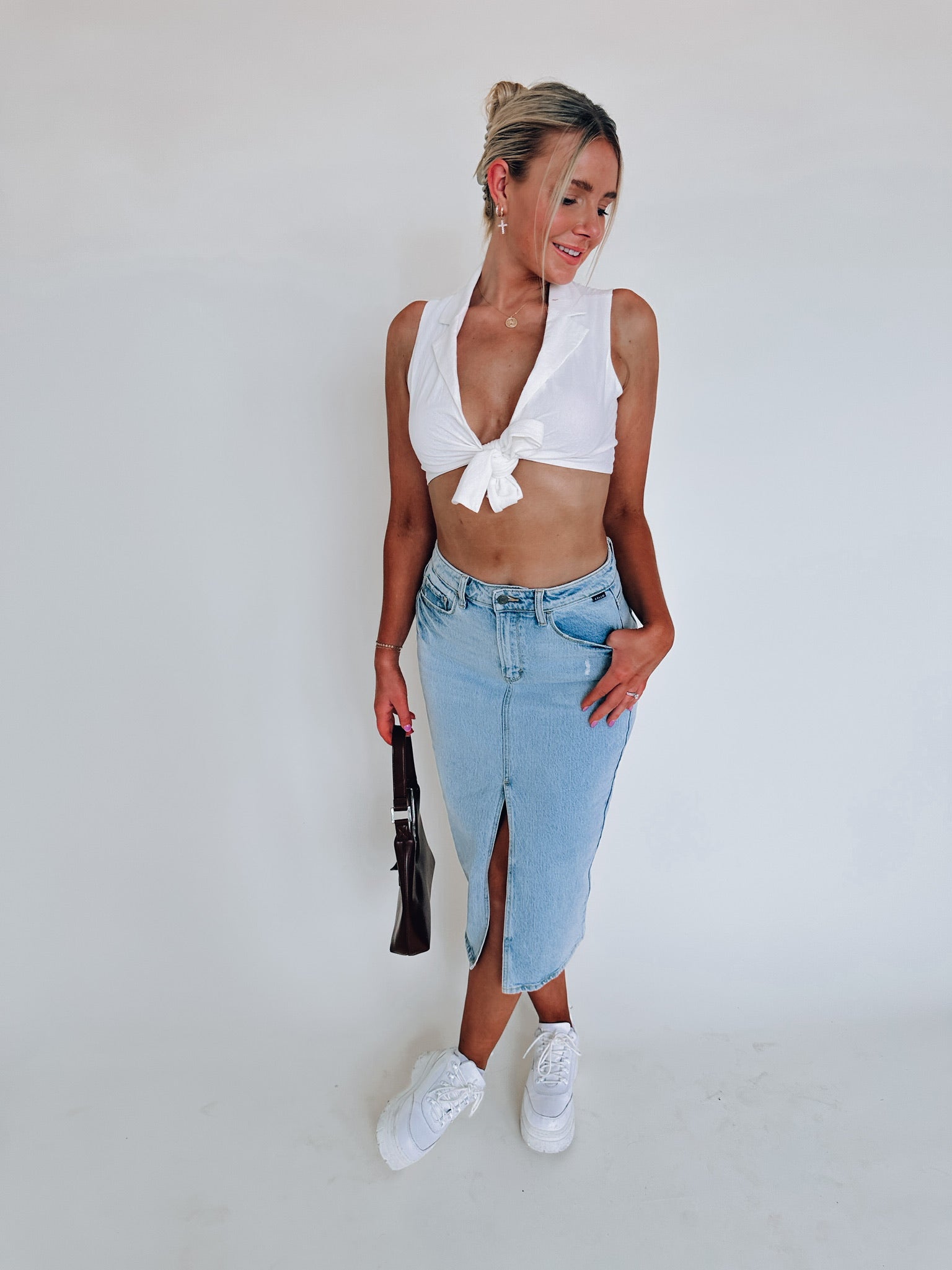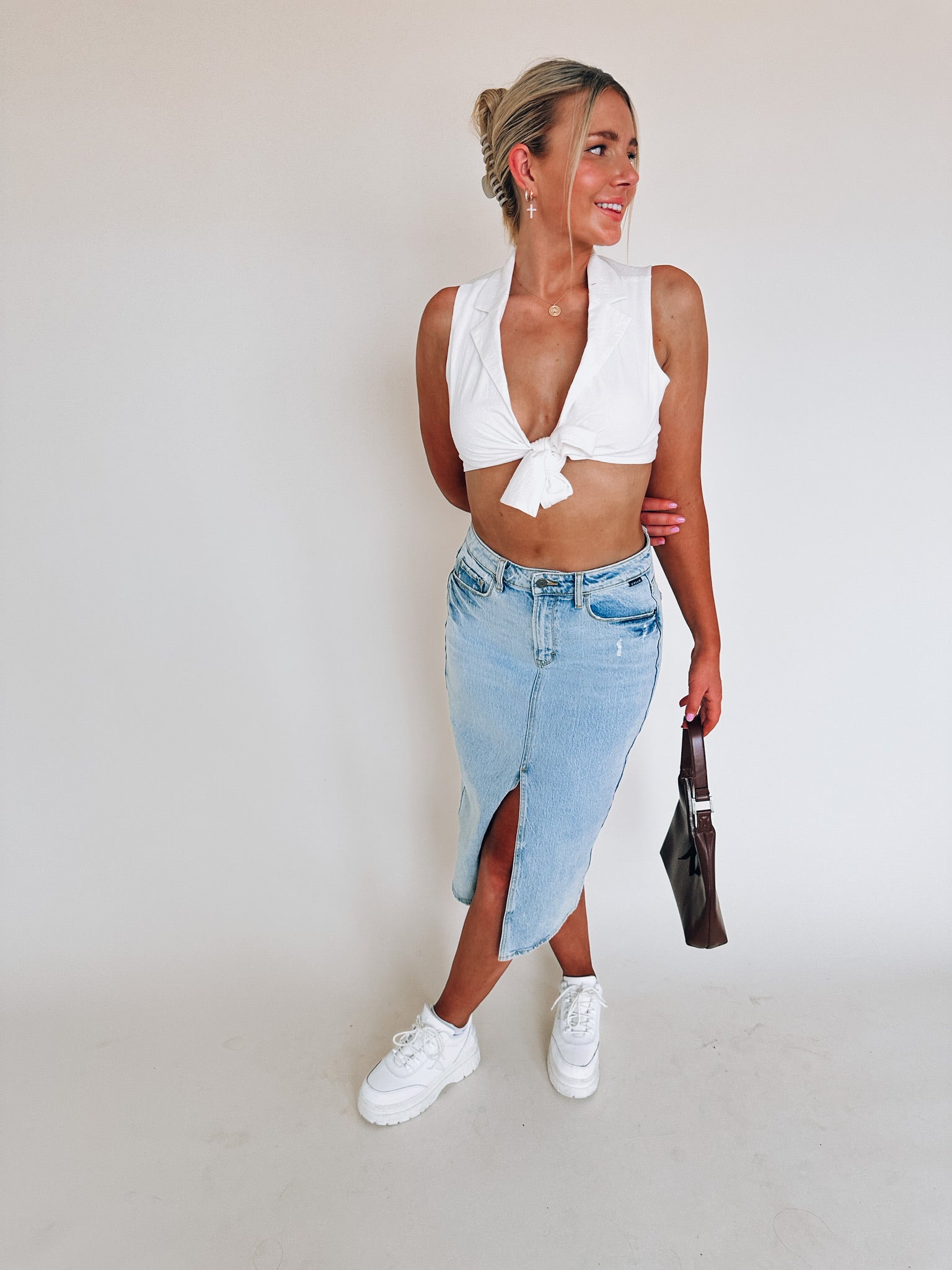 Our Skylar Front Tie Top is a cropped collared lined top with a front tie detail. This top features a front tie detail that makes this top a customizable fit. The front of this top is lined.