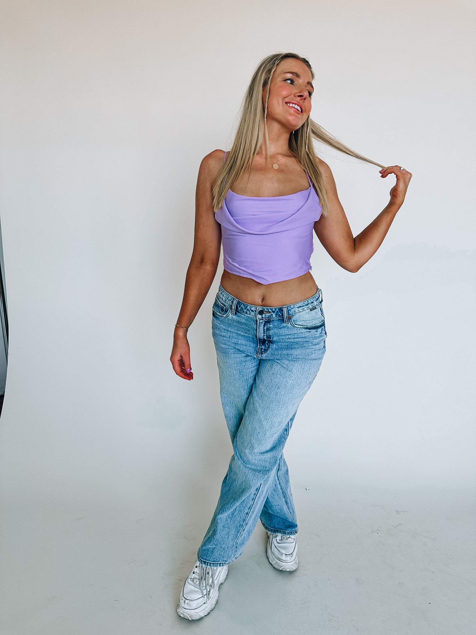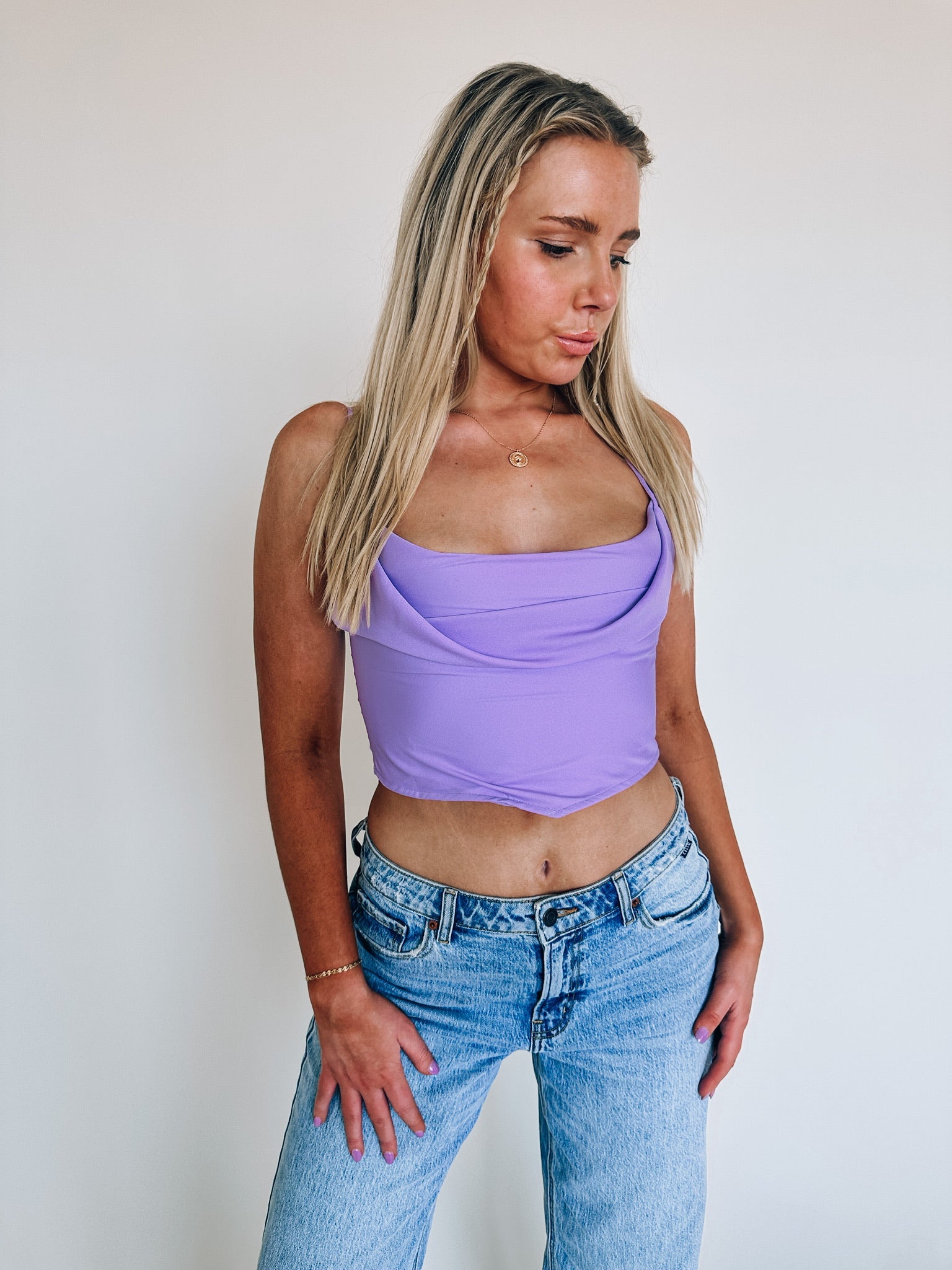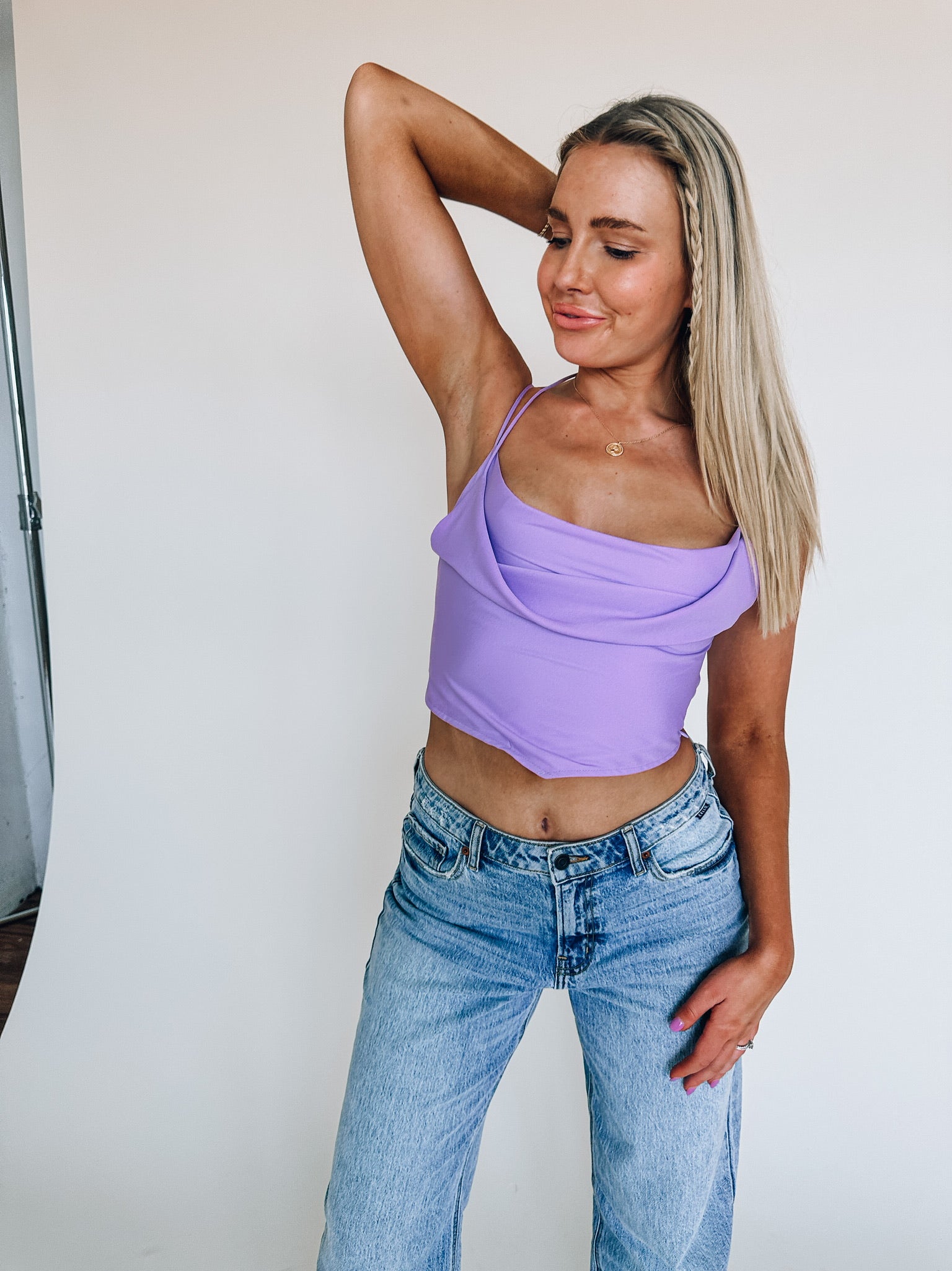 Our Eliana Lavender Tank is a lightweight chiffon cami top. This top features a double halter straps with a scoop neckline. The ties are adjustable and the back laces up. This top is double lined and has stretch.