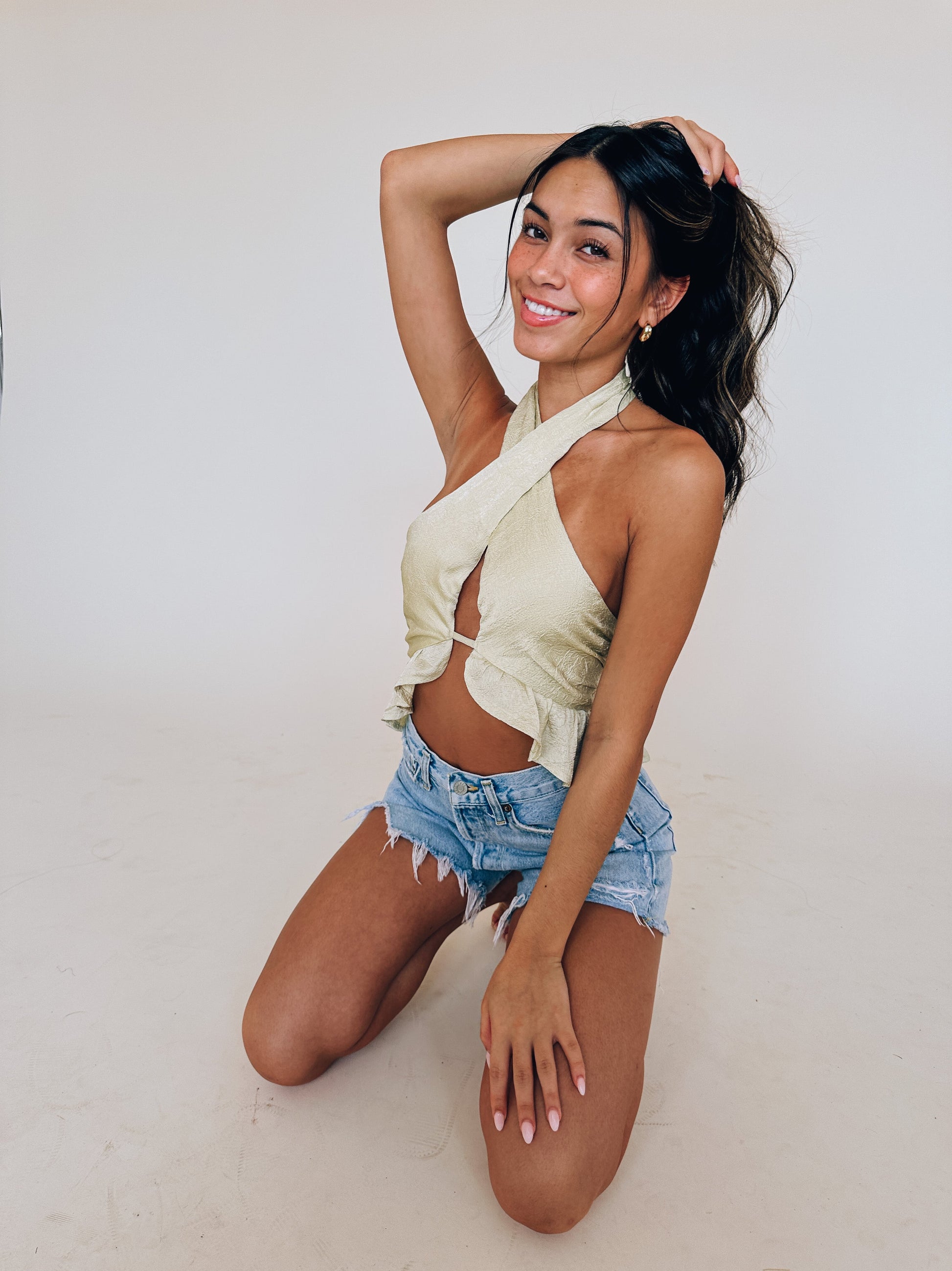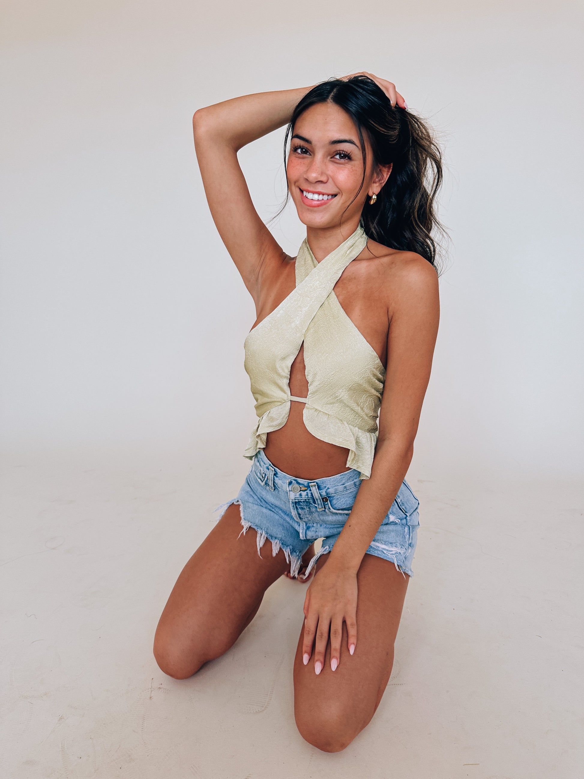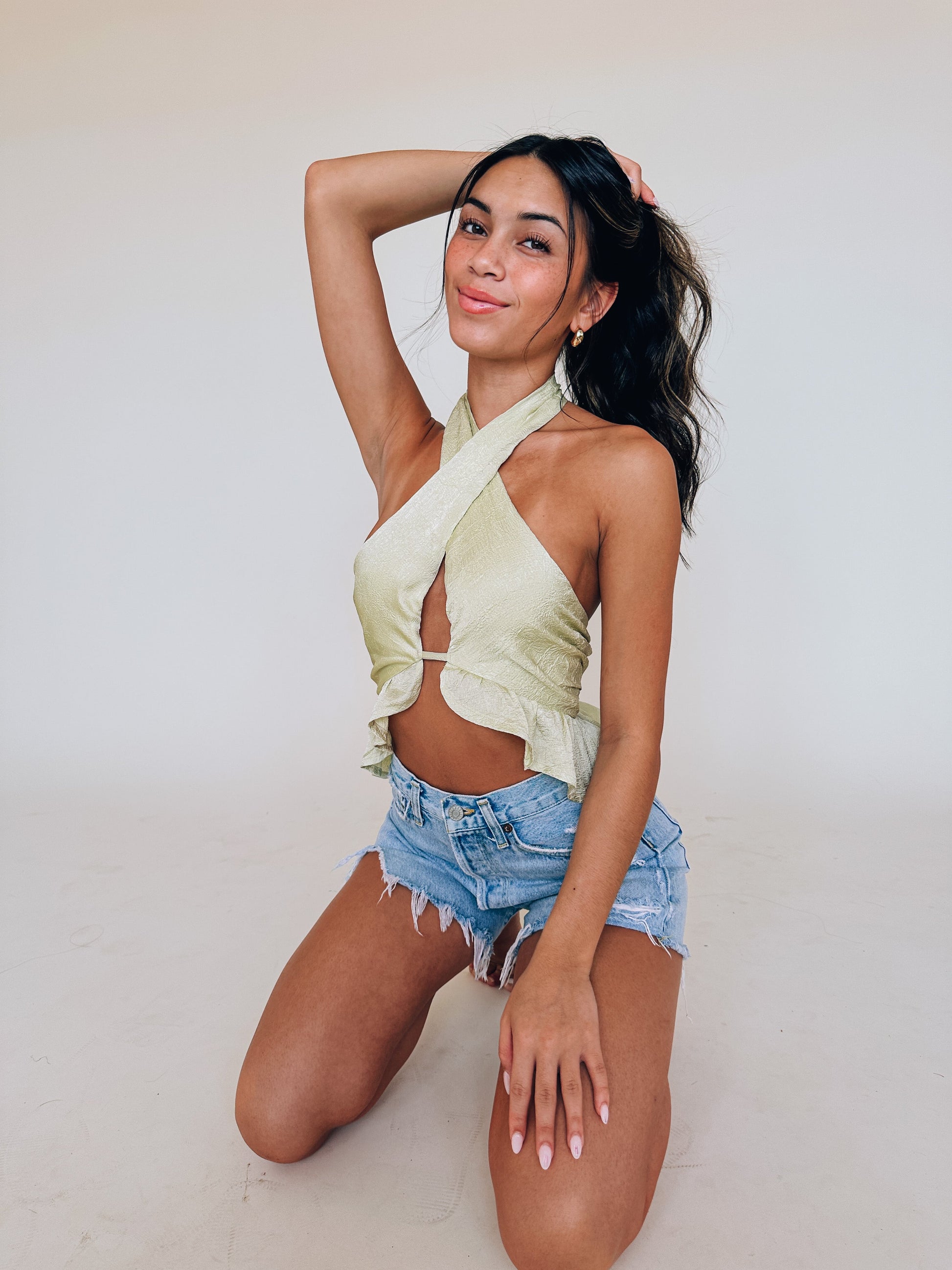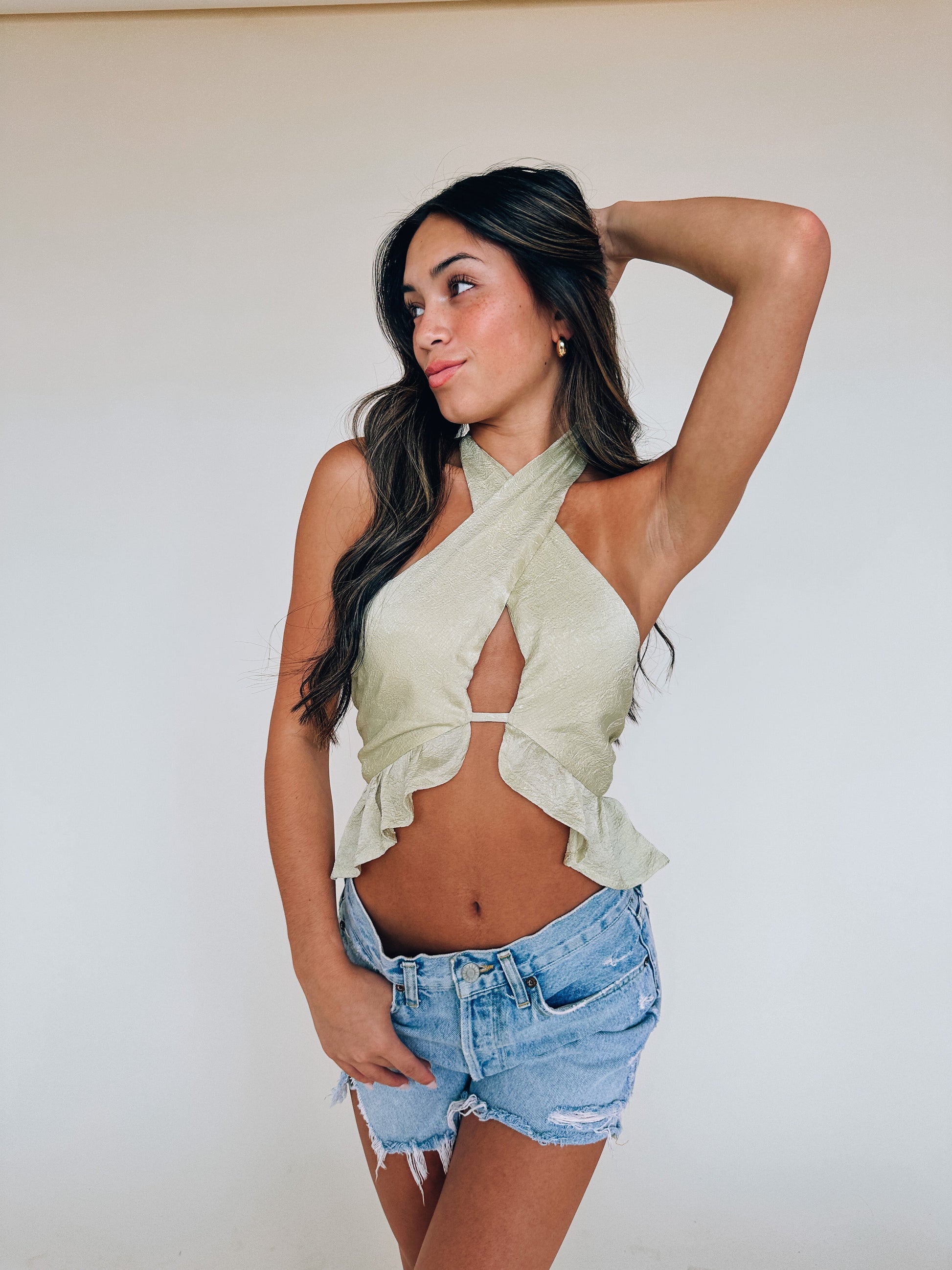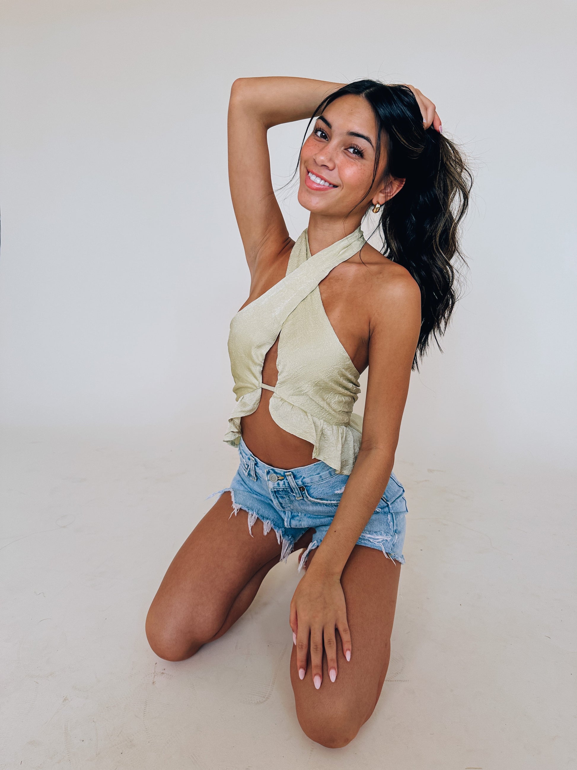 Our Green Tea Halter Top is a crinkle fabric with a ruffle detail halter top. This top features a halter neckline with a ruffle hemline and open back.