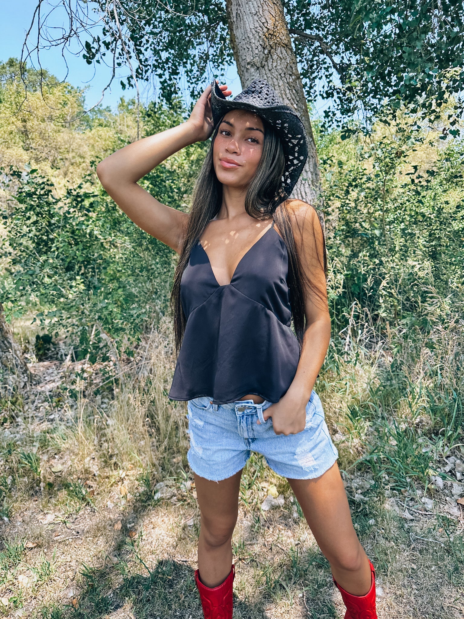 Our Charlee Lace Up Tank is a fit and flare tank top. This top features a v-neckline, lace up back and side details, and a ruffled hem and flowy silhouette. This top has a self adjustable lace up the back for the perfect fit and it has stretch.