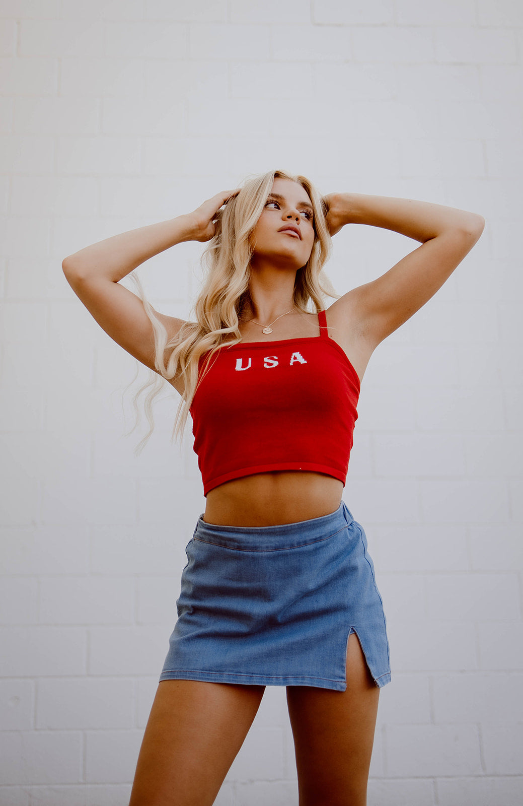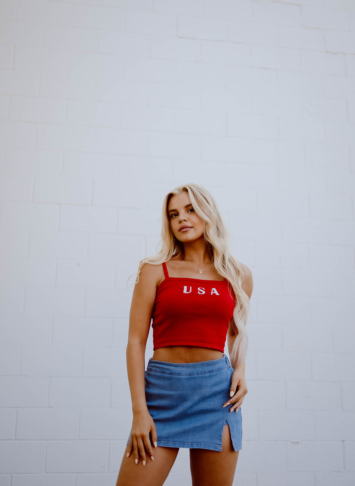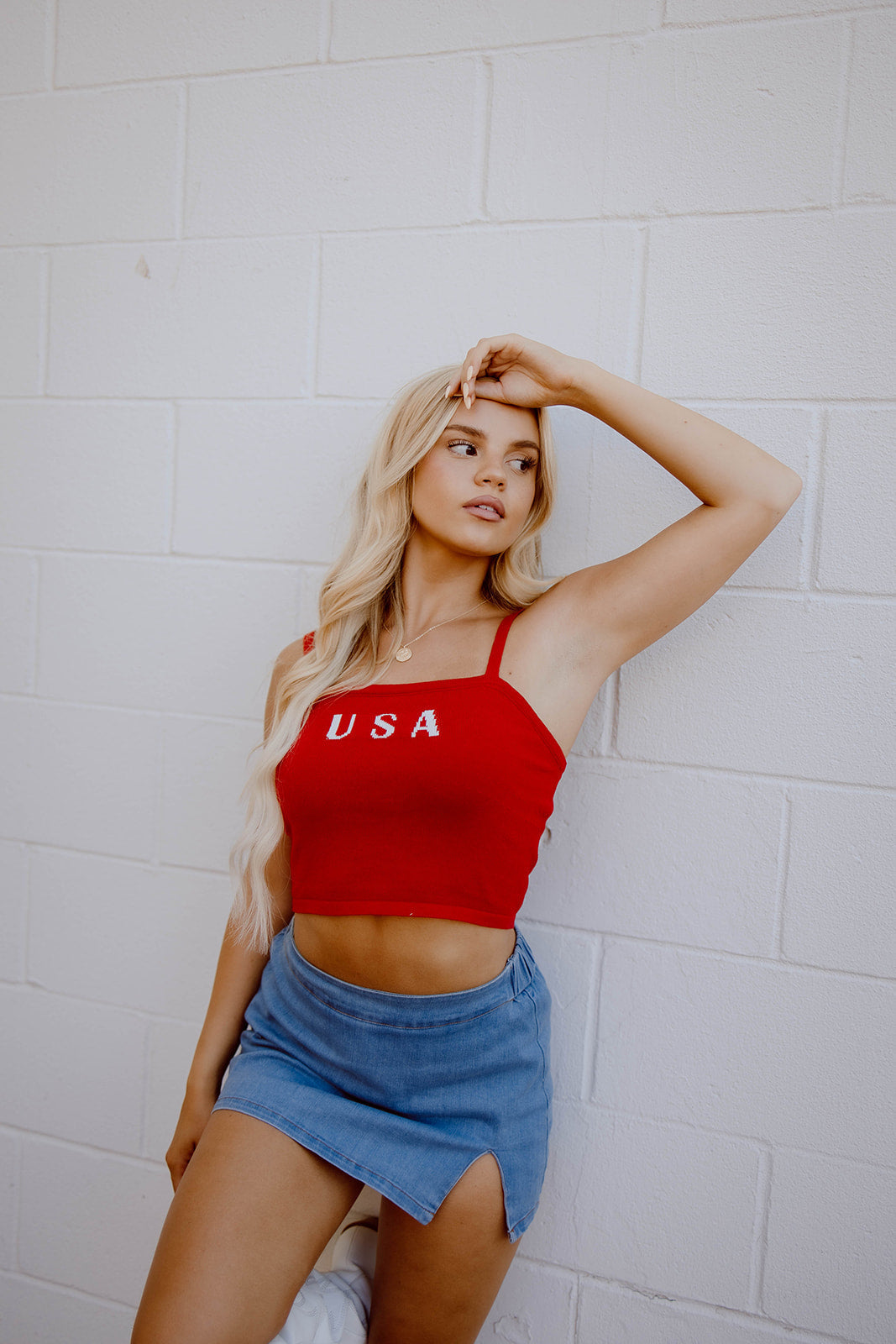 Our USA Knit Tank is a knit tank top with a square neckline and cropped fit. This festive tank features adjustable straps and white "USA" graphic on the front which makes it perfect for any and all of your fourth of July festivites. This top is made of a lightweight and thin knit material that makes it perfect for any time of year.