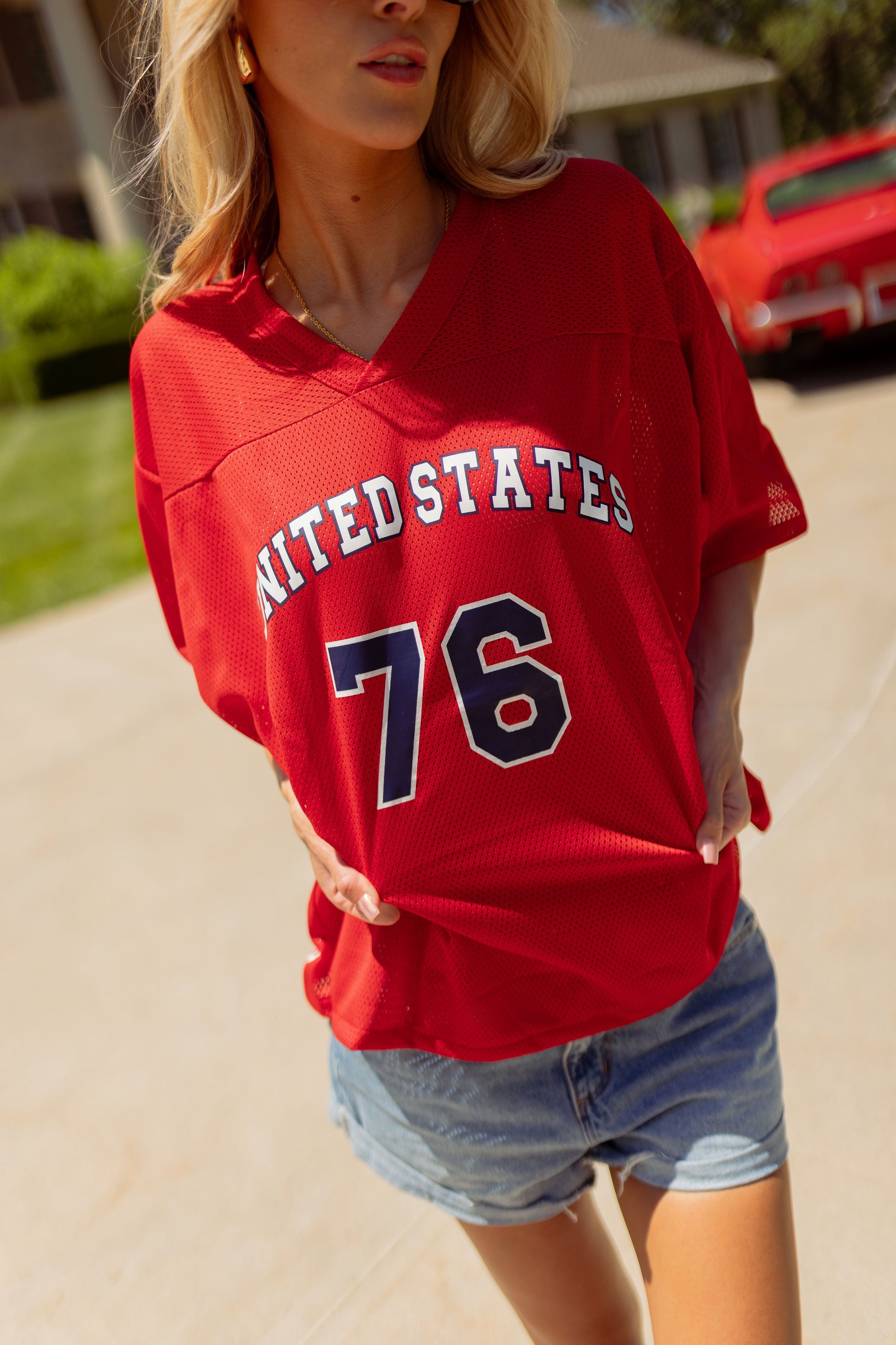 Our United States Football Jersey is a two toned United States Graphic on the front with oversized number. This Jersey is made of a lightweight and breathable jersey material. This jersey features a vneckline and oversized fit. This traditional practice jersey is a custom made MADIDA EXCLUSIVE that is sold exclusively at Madida and is perfect for your Fourth of July festivites.