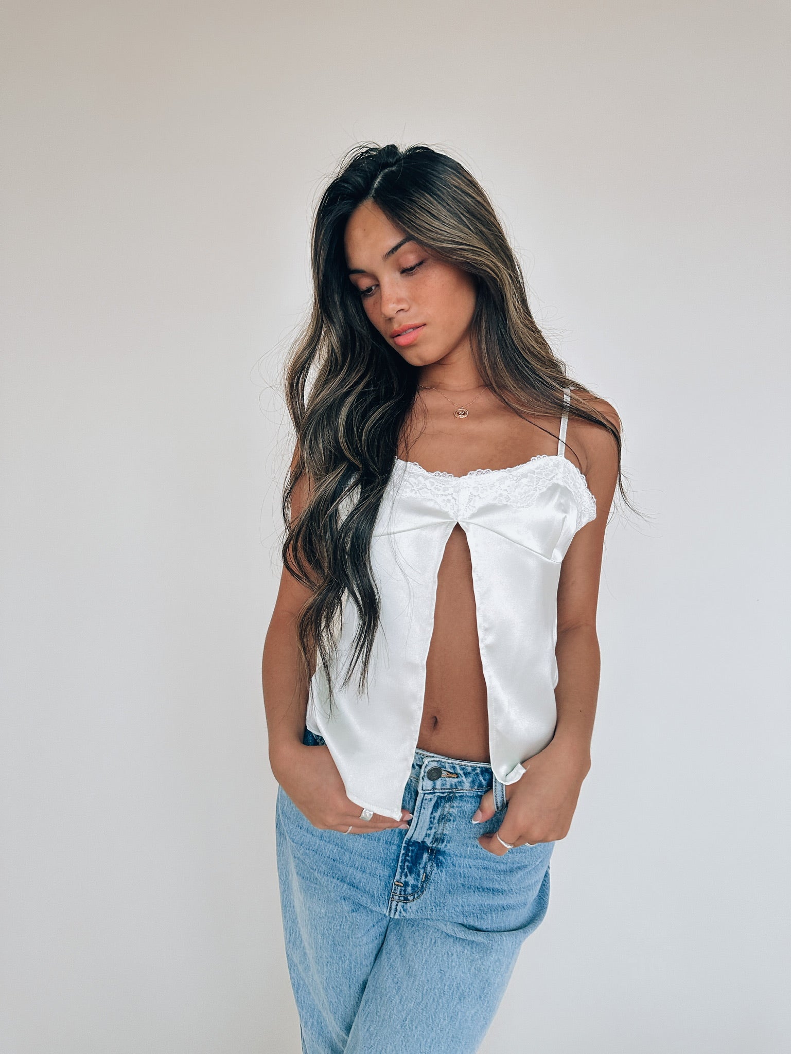 Our Tinker Split Tank is a tank top with a center split hemline. This top features an emphasized bustline with lace ribbon along the sweetheart neckline. The thin straps are adjustable and there is a hidden side zipper with a hook and eye clasp. The bodice of this top has a ton of movement throughout to give this top a romantic and effortless look.