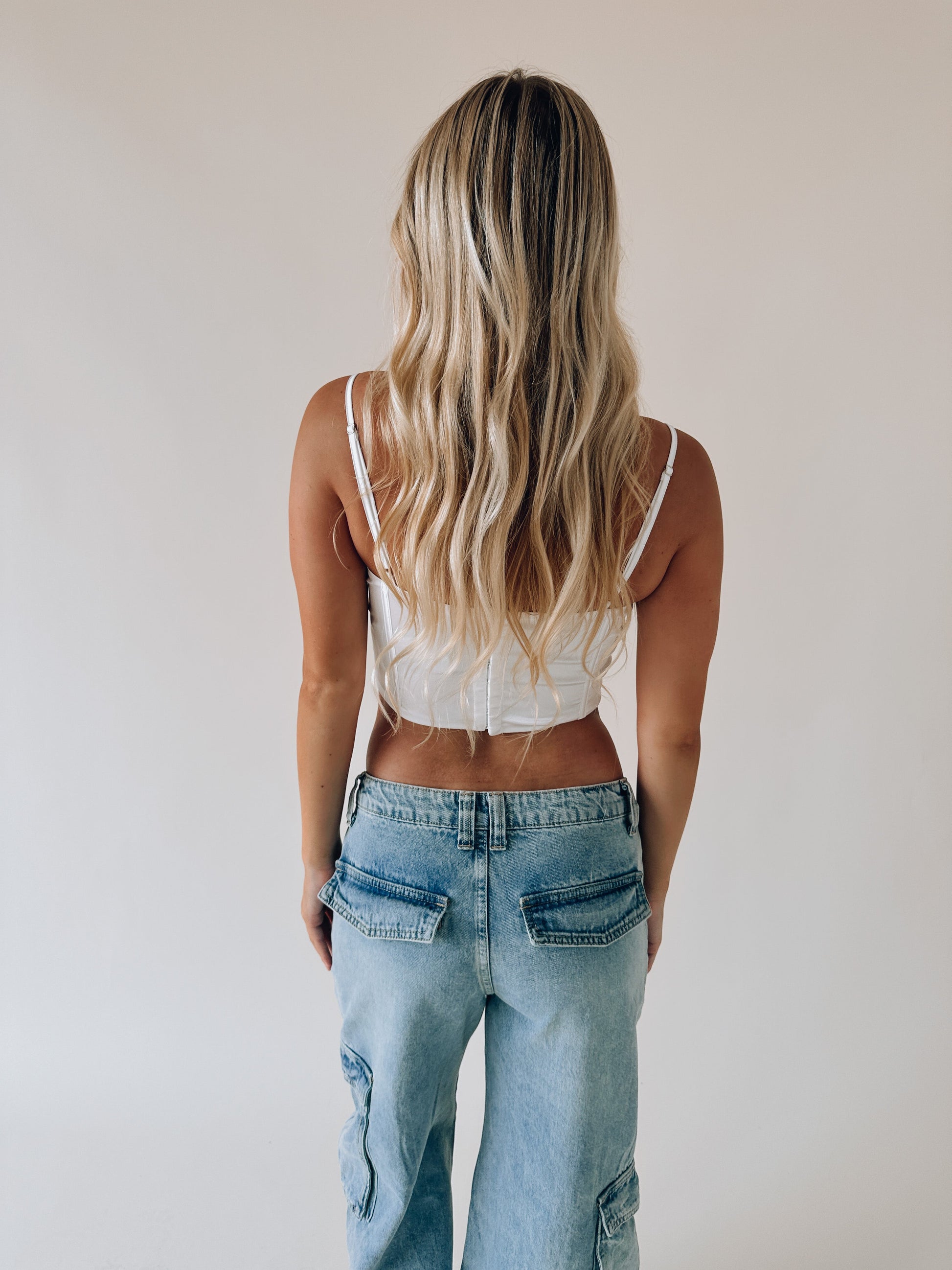 Our Zoey Satin Bustier Top In White has two thin adjustable straps. This bustier top has a white very soft satin fabric that has a good stretch to it. There is boning detail on the front and back to give it structure. Also, there is accent lace details along the top front of the top. There is a hidden 9 hook and eye closure. Pair this top with cute bottoms for a fun night out!