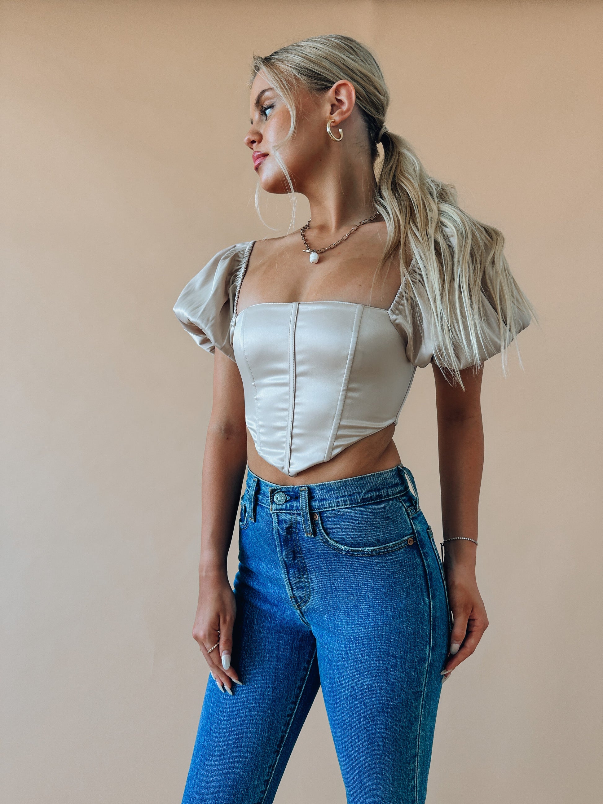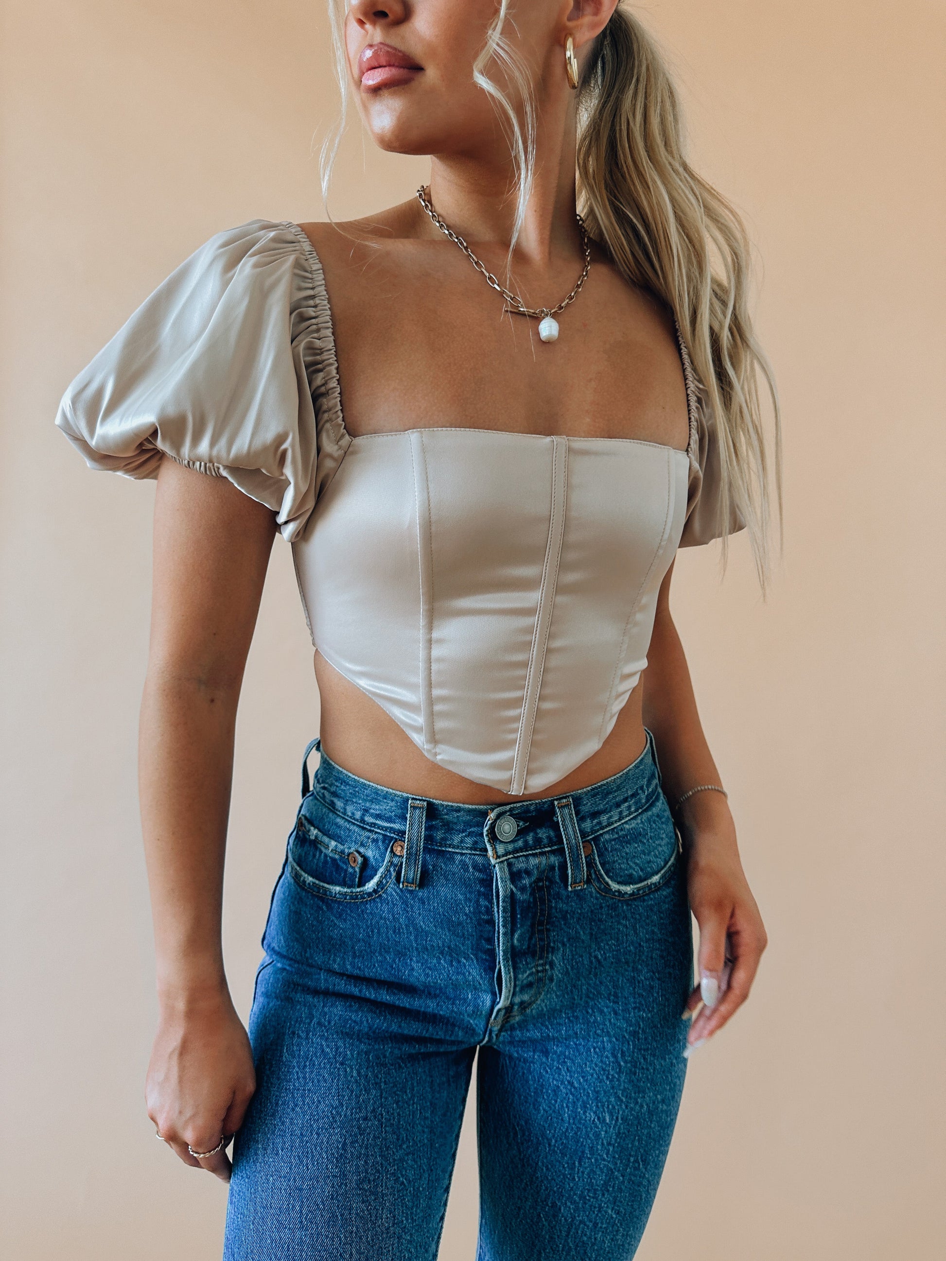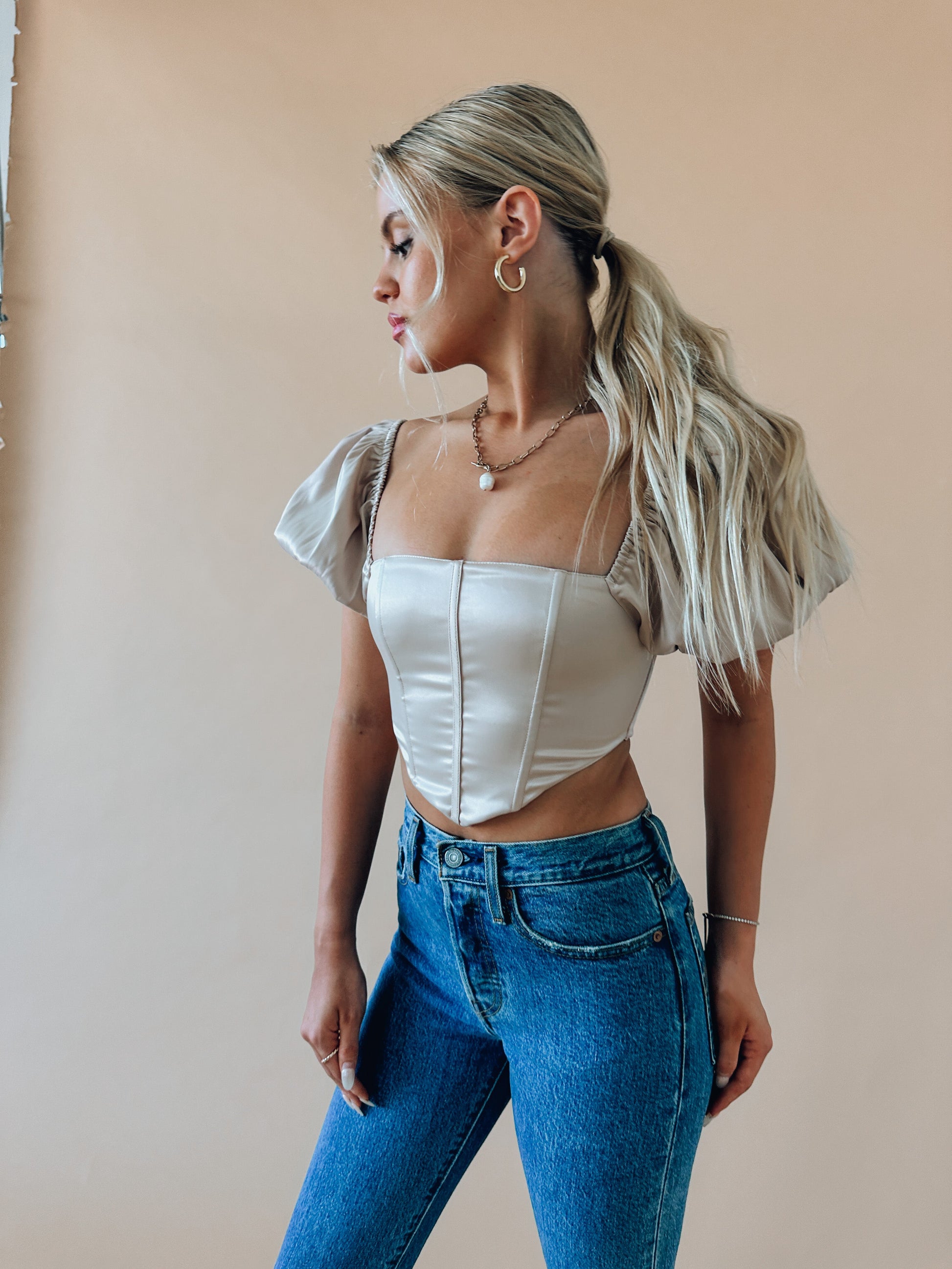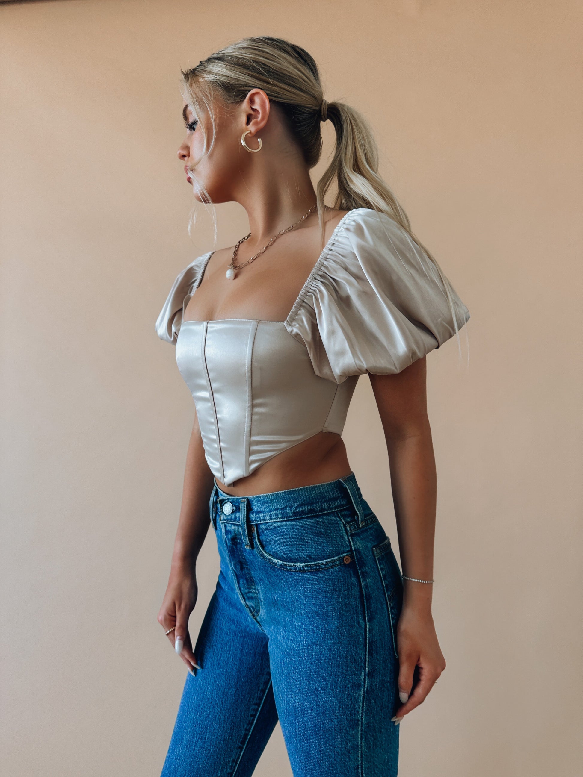 Our Cayla Corset Top is a satin cropped corset with unique puff sleeve detail. This top features a square neckline, fitted bodice with structual boning throughout, and rounded hemline . This top is completed with an exposed zipper closure and is fully lined . This top does has some stretch throughout but does run small so if in between sizes we recommend sizing up