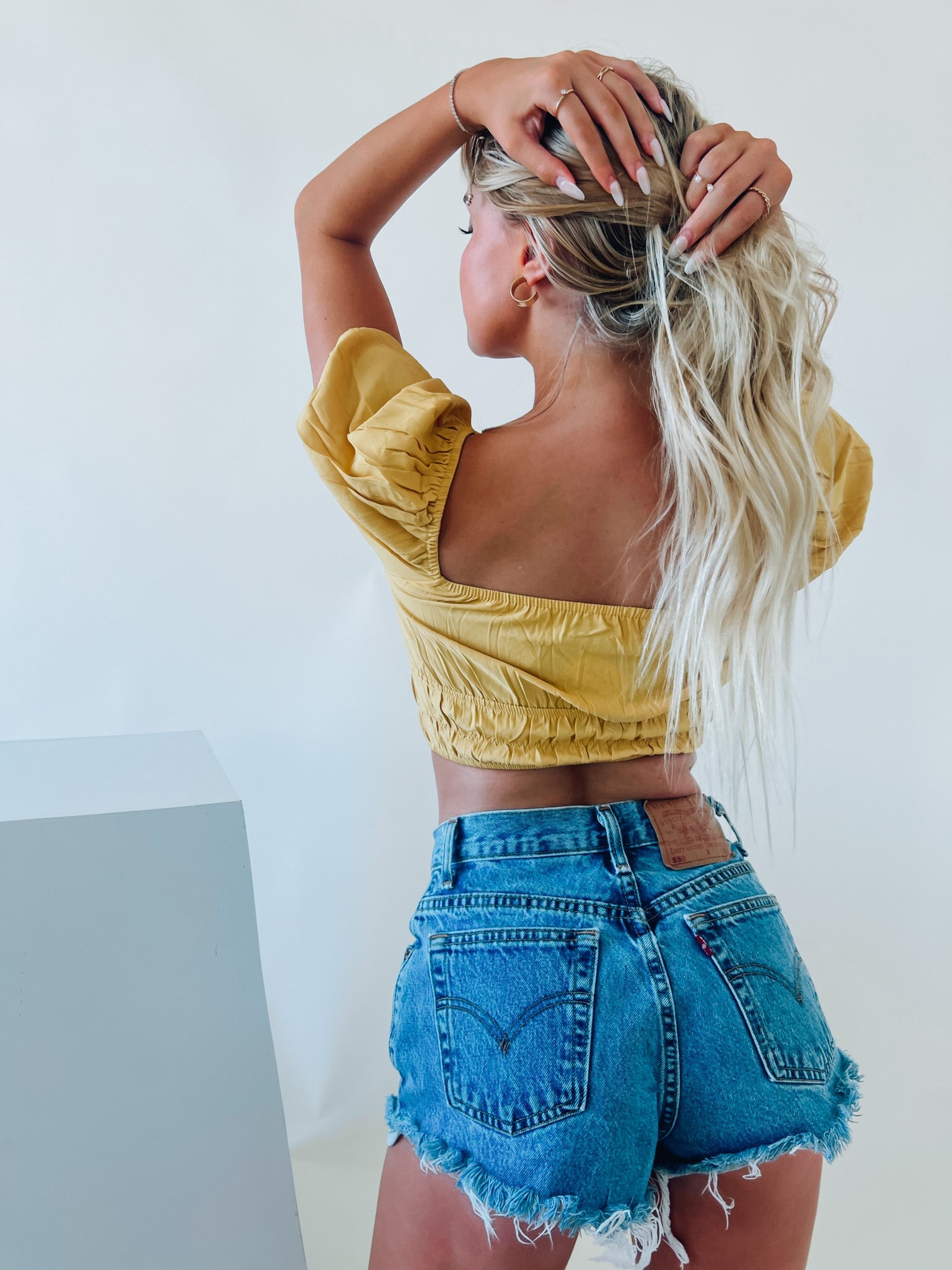 Our Demi Puff Sleeve top is a short sleeved crop top with a cropped fit with elastic bands throughout the bodice to give this top a figure flattering fit. This top is completed with an elastic sweetheart neckline. This top is made of a light weight material that is perfect for summer. This top is true to size and has stretch throughout.