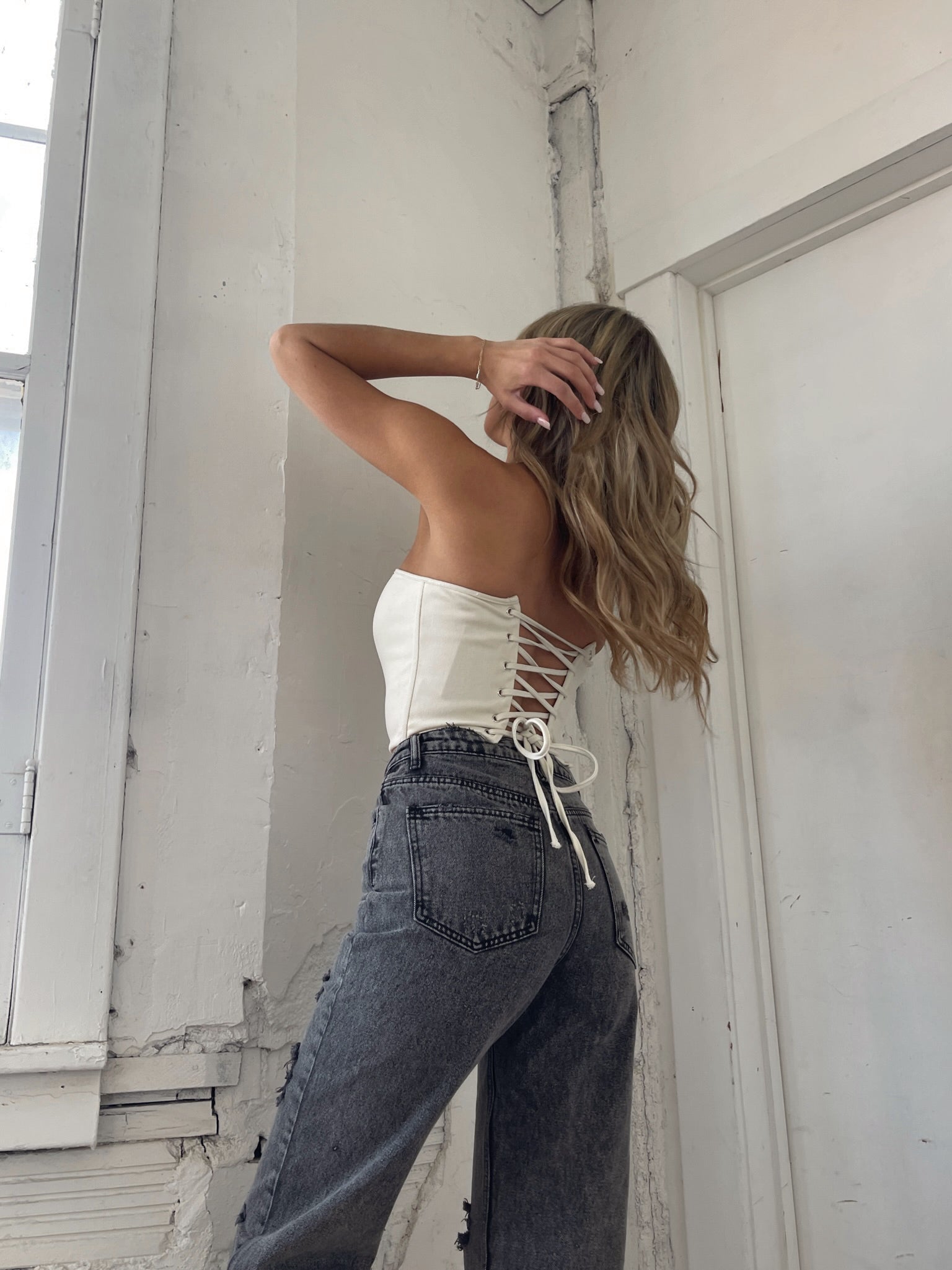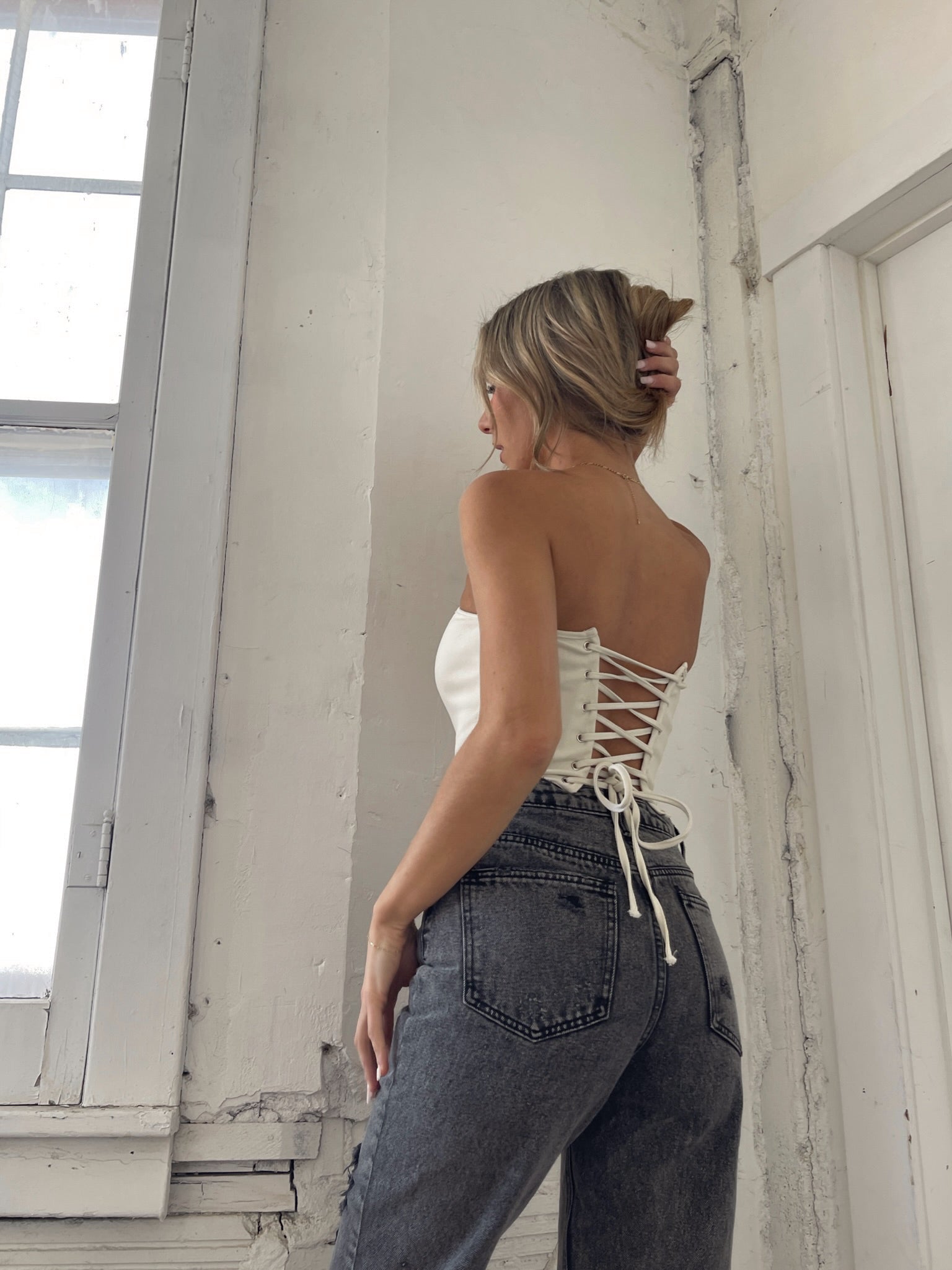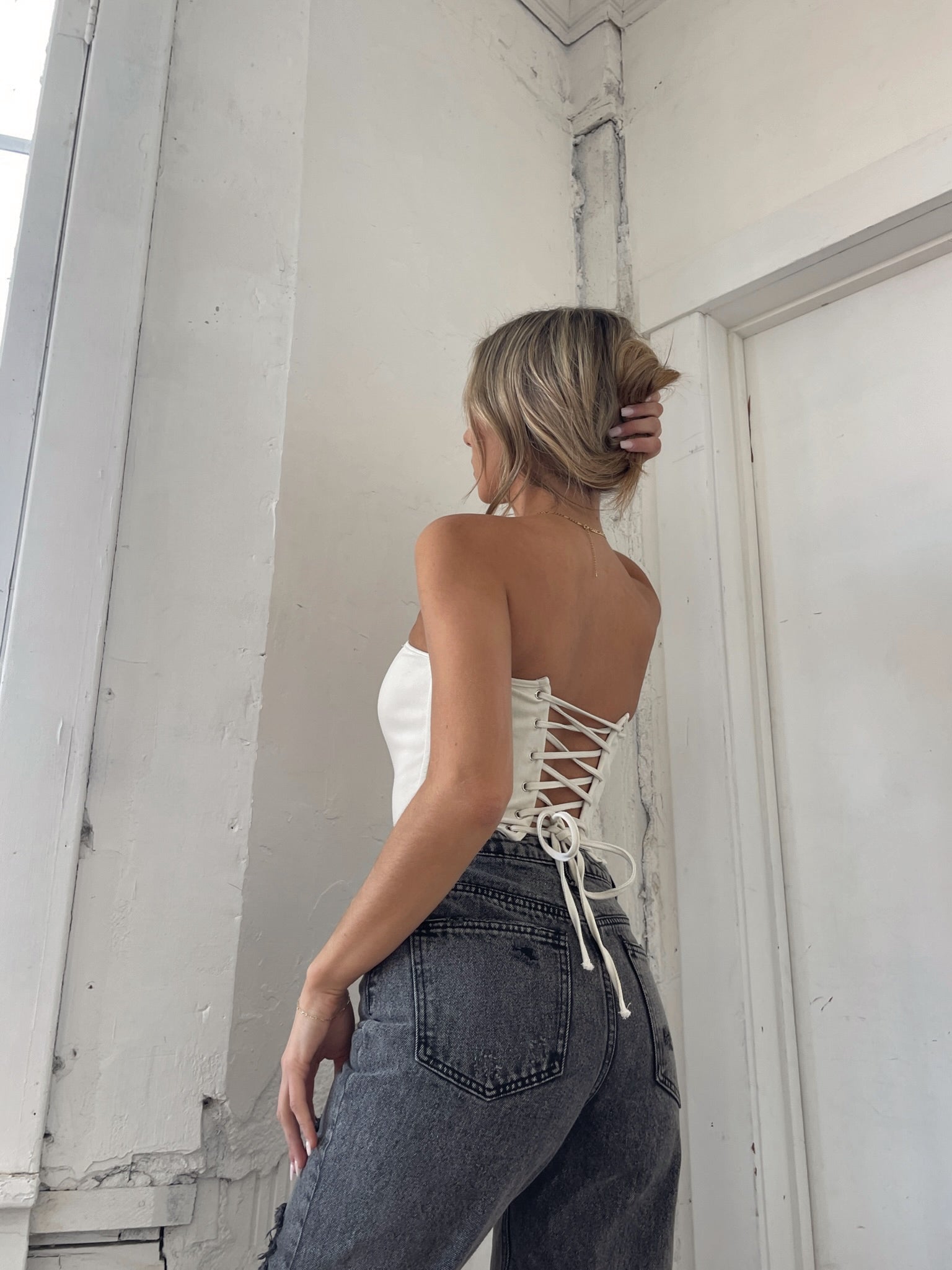 Our Aimee Corset Top is a fully lined denim corset top. This cream corset top features a square neckline, structured boning throughout, and self tie lace up closure in the back. This top is so structured it doesnt have much stretch. However, the lace up detail in the back allows you to customize the fit.