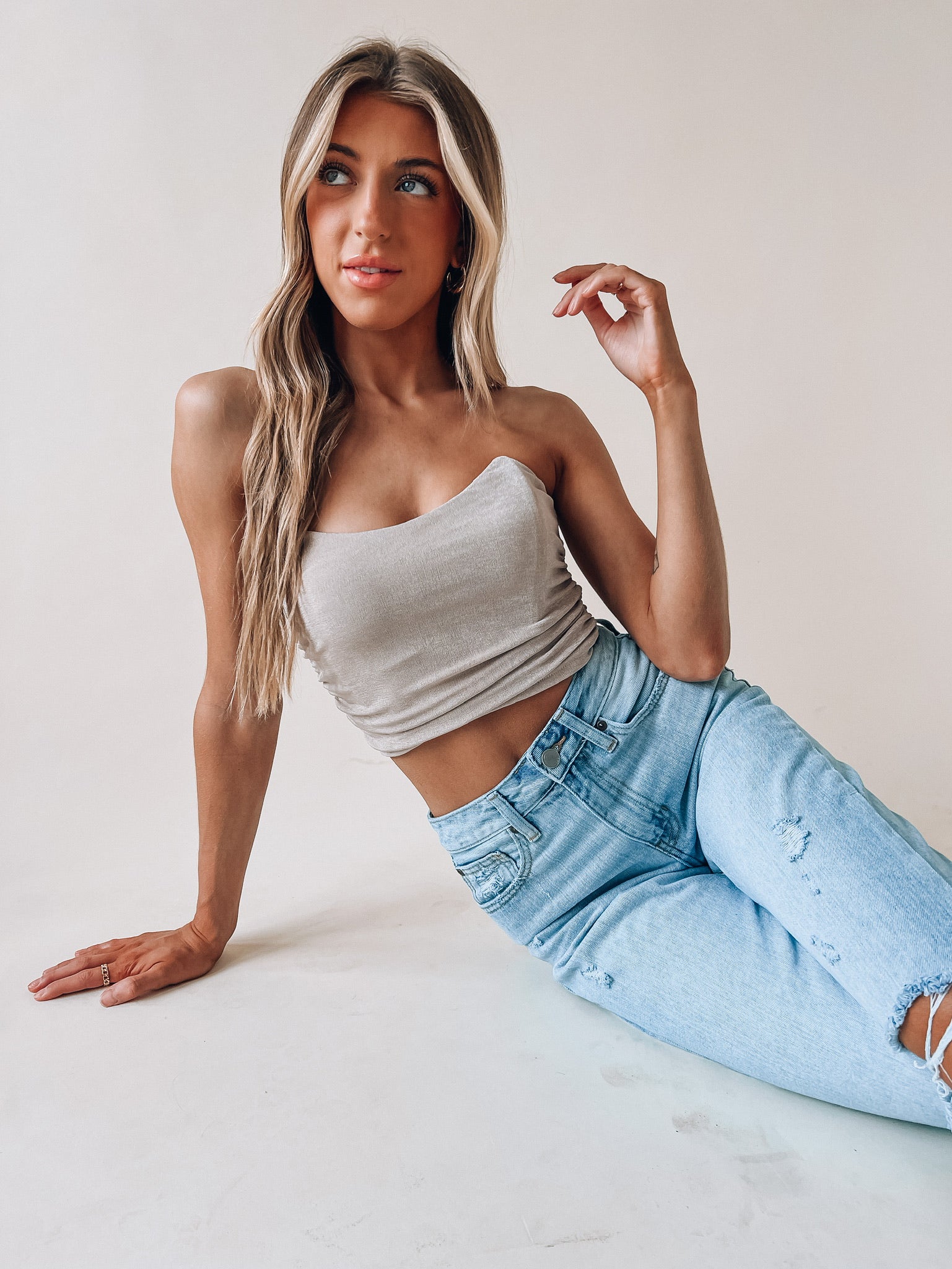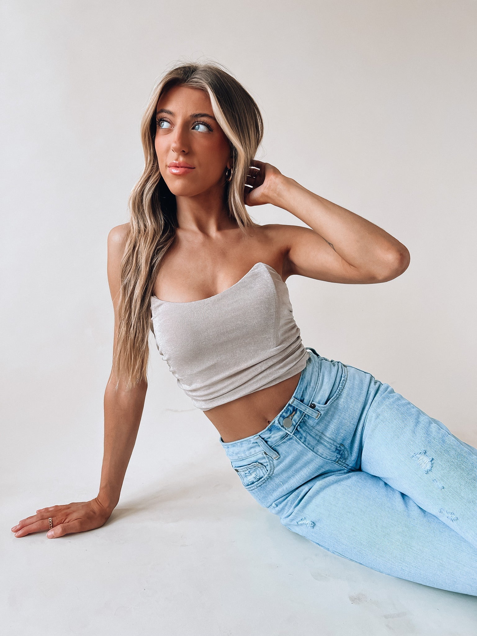 Our Taupe Ruched Fitted Crop has soft to the touch sheen fabric. There is boning detail on the front and back of this top to help keep its shape and to help it stay up. The sides on this crop are synched. The inside is LINED and there is a back zipper closure with a hook and eye clasp.