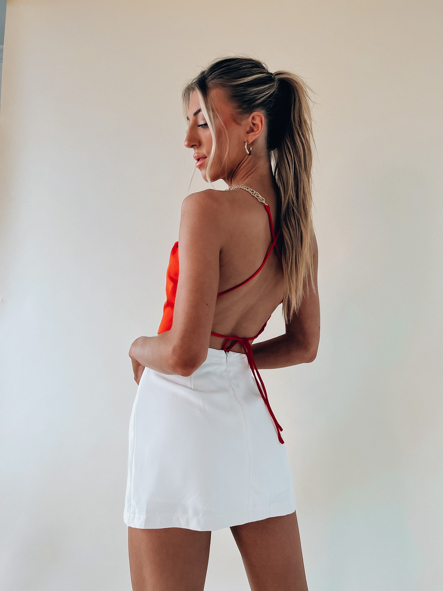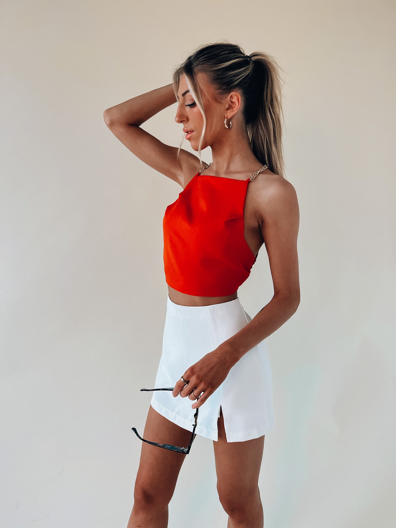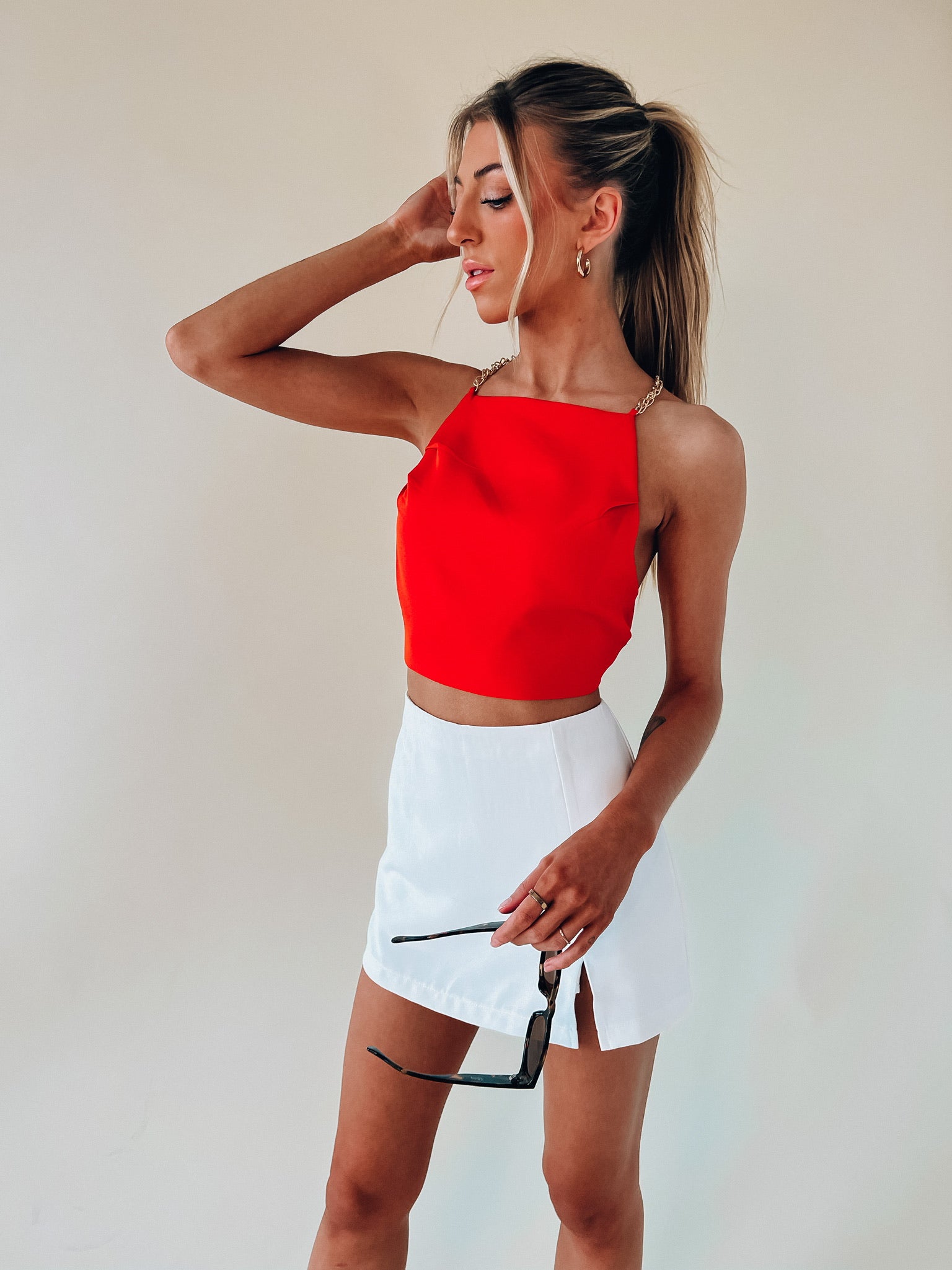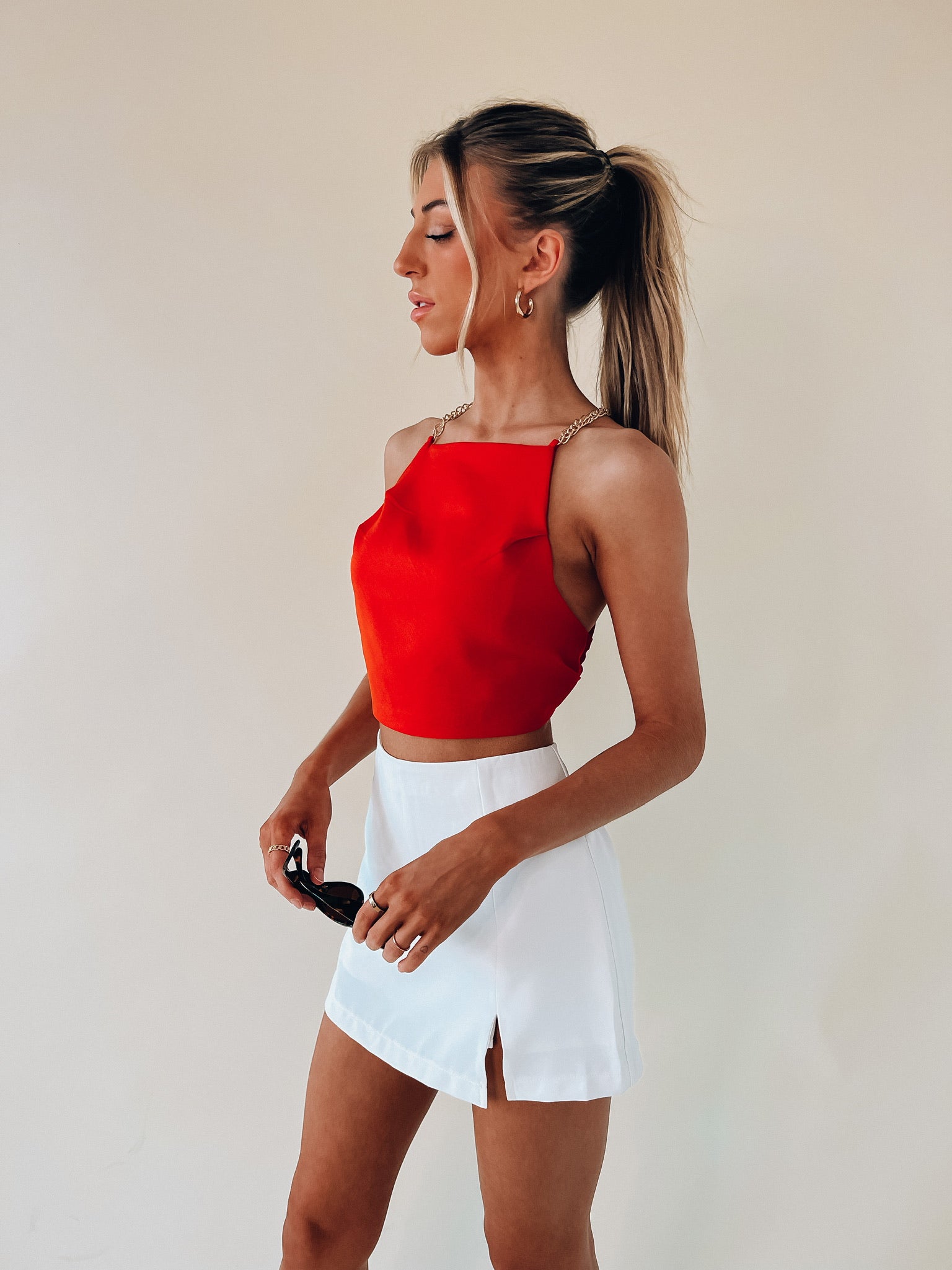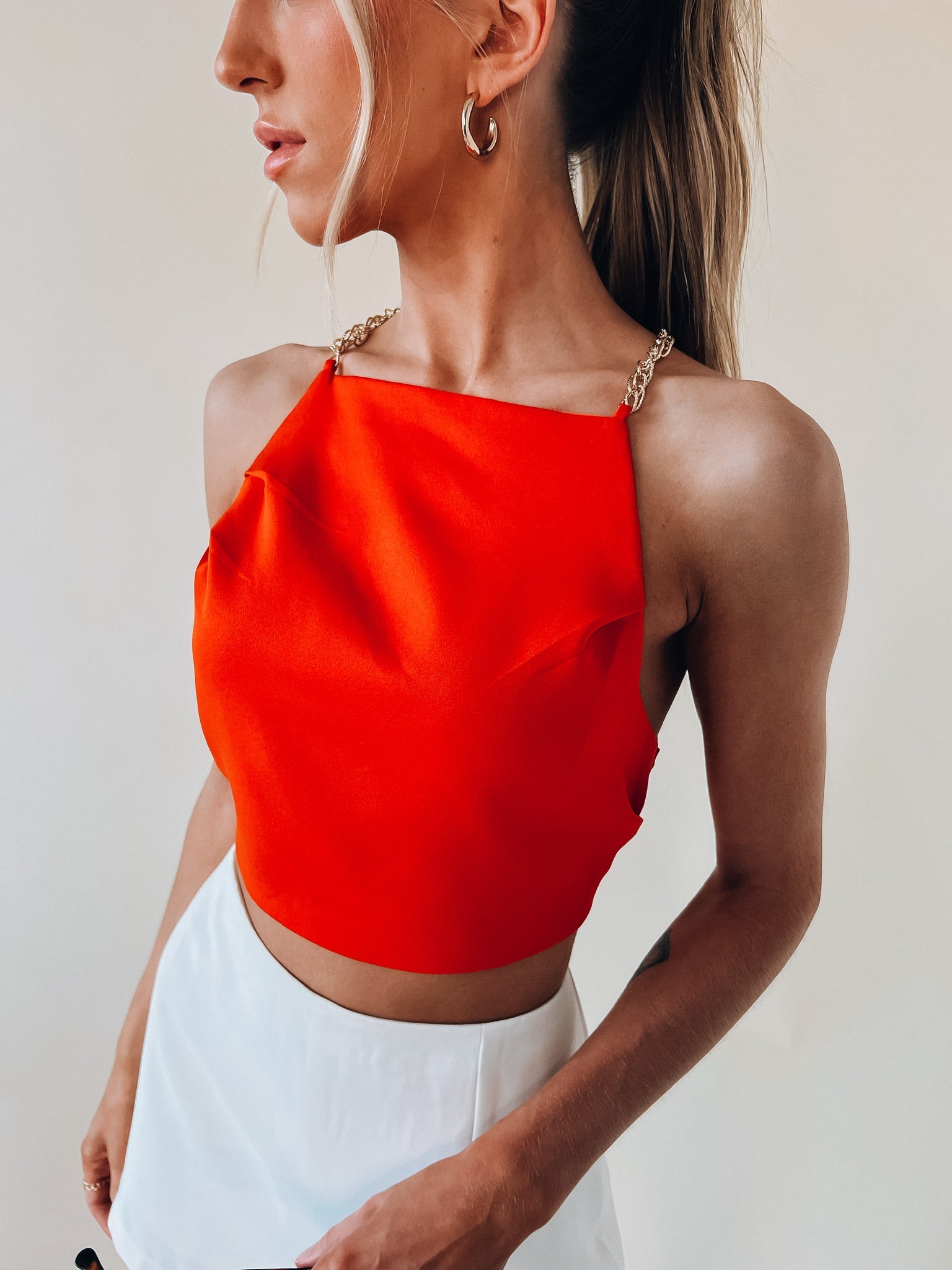 Our Daylin Chain Strap Top features a cropped fit, high neckline, and open back. The gold interlocked chain detail on the straps takes this top to the next level. The back of this top features self tie detail which creates a customizable fit.