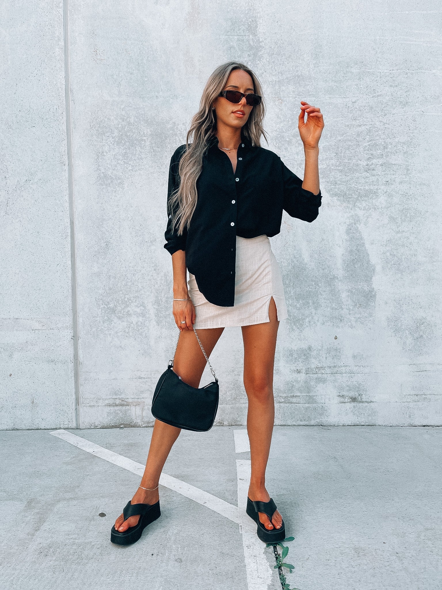 Our Sofia Black Button Down Top is a great overpiece for ANY outfit! It has a stitched pocket on the front and a collared neck. There is a button down closure.