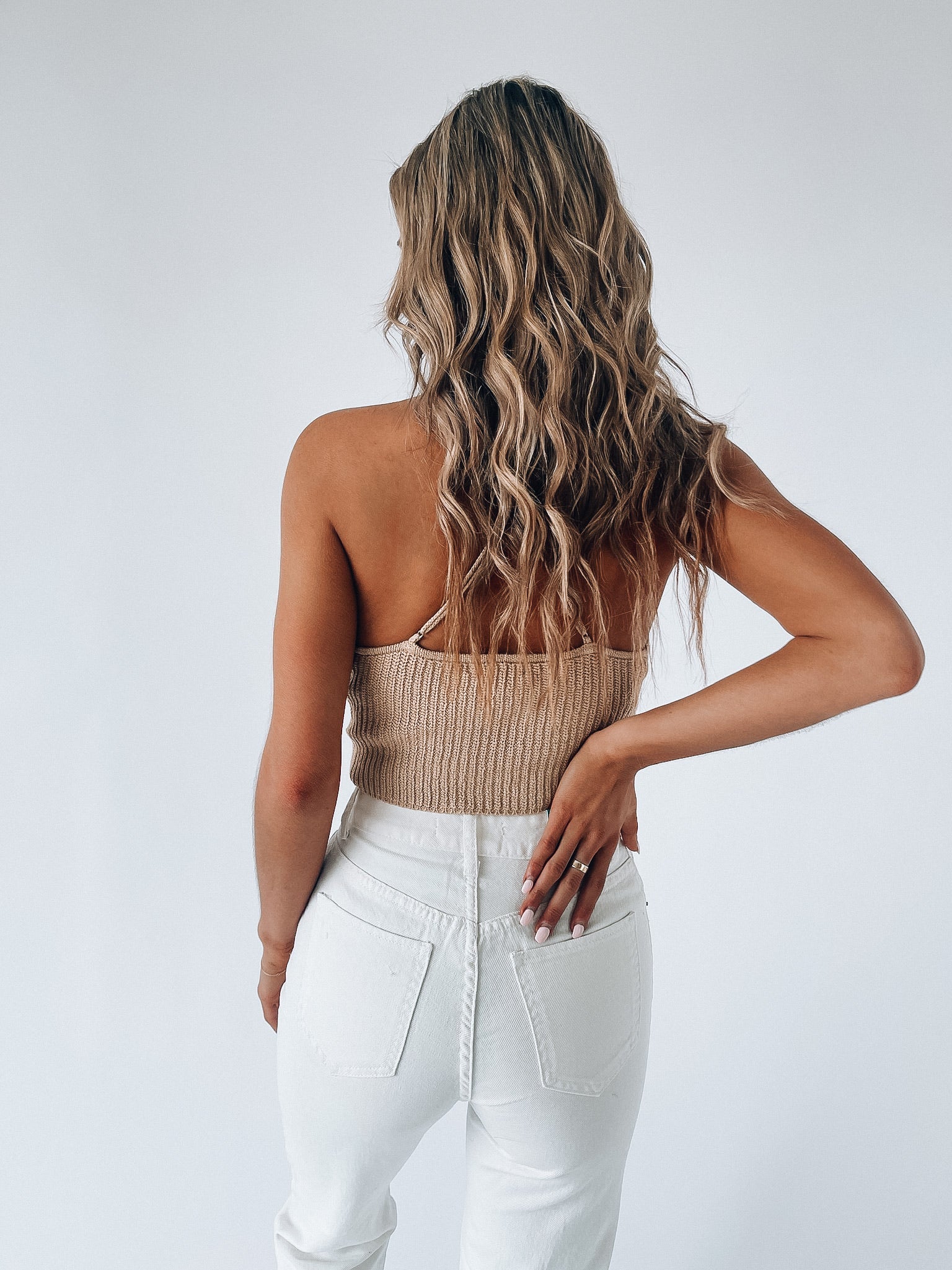 Our Halina Crochet Halter Top is a lightweight knit halter top with a cropped fit. This top features lace up detail in the bodice and customizable self tie neckline that creates an adjuatble fit.