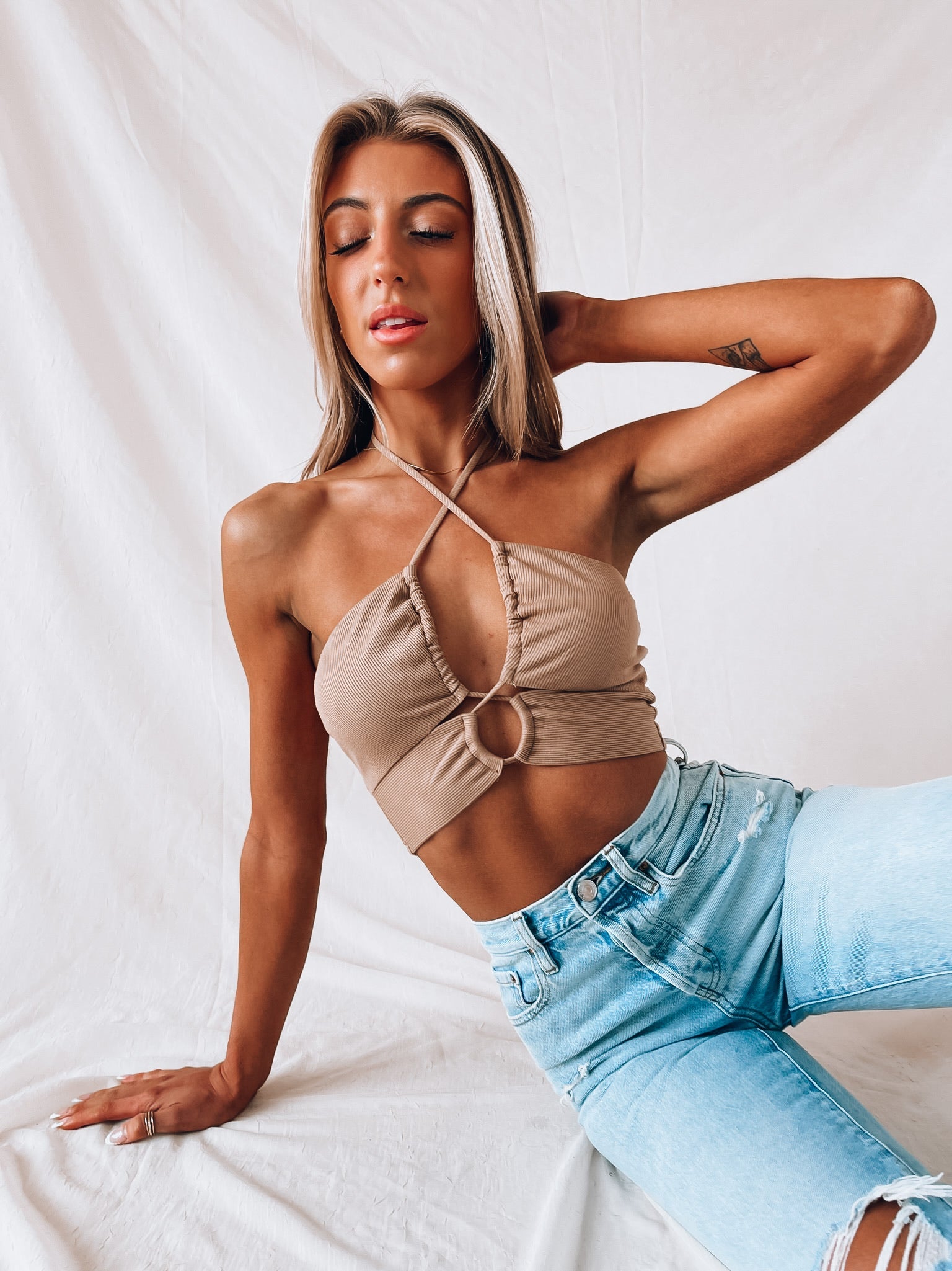 Our Mailey Criss Cross Halter top is a ribbed fitted crop top. This crop has a self tie cross halter tie. The front of this top has a two key hole detail. The front vcan be synched with the self tie to make the hole smaller or bigger. The back is an open back.