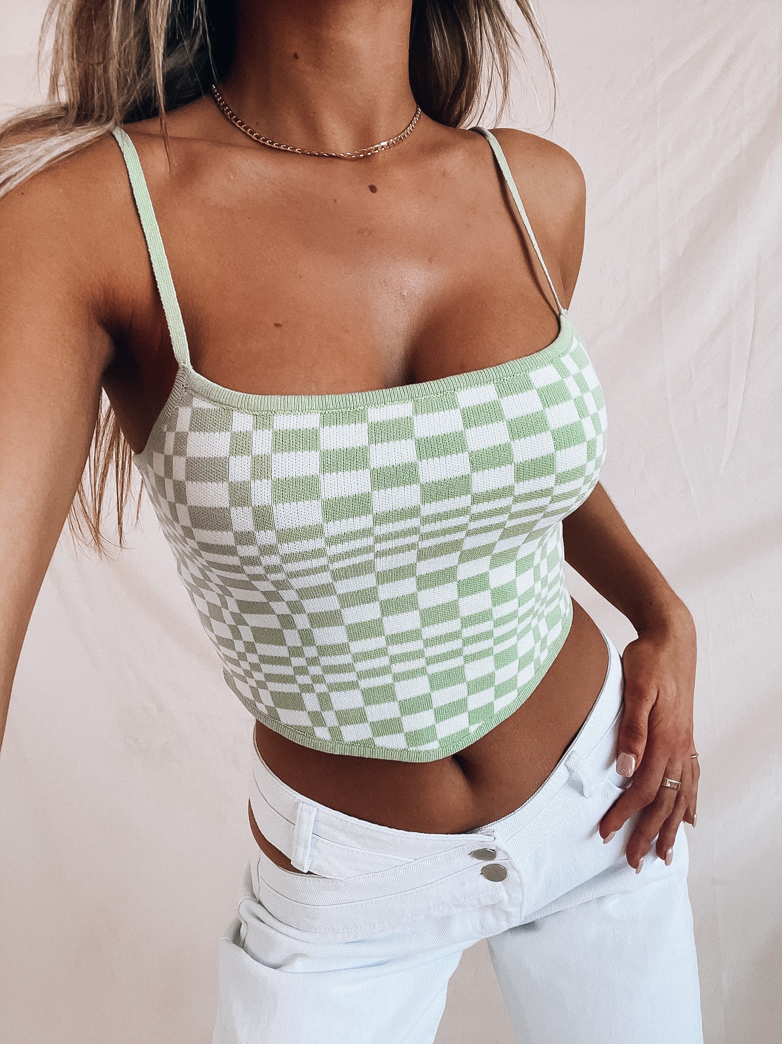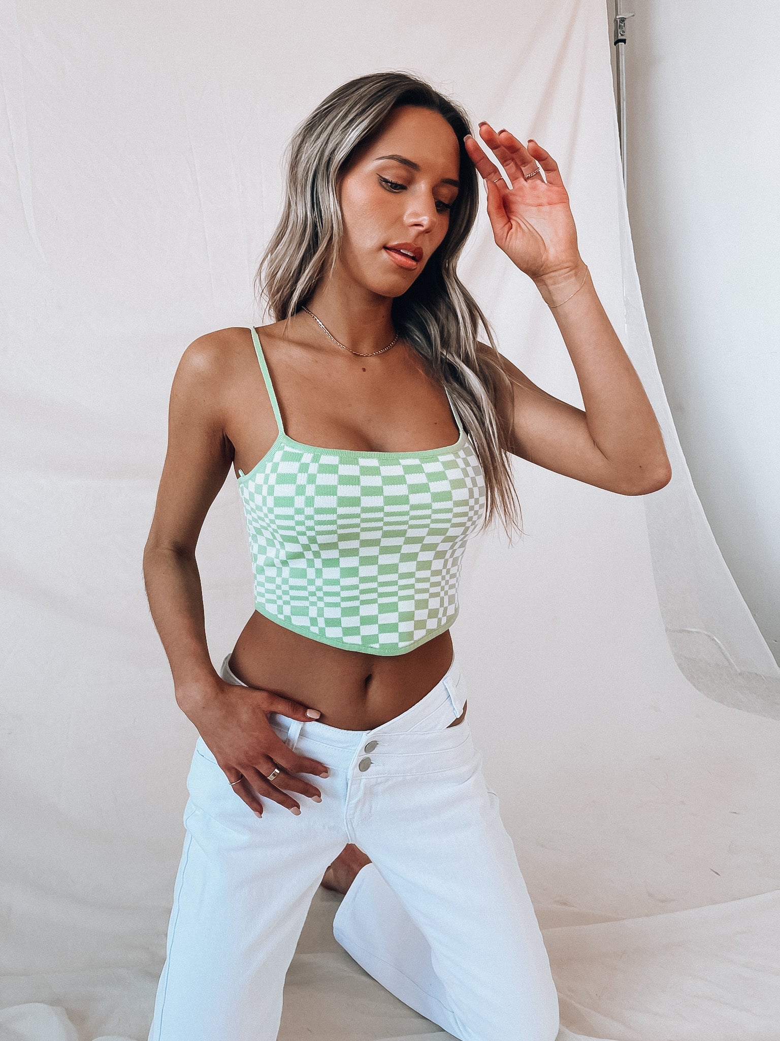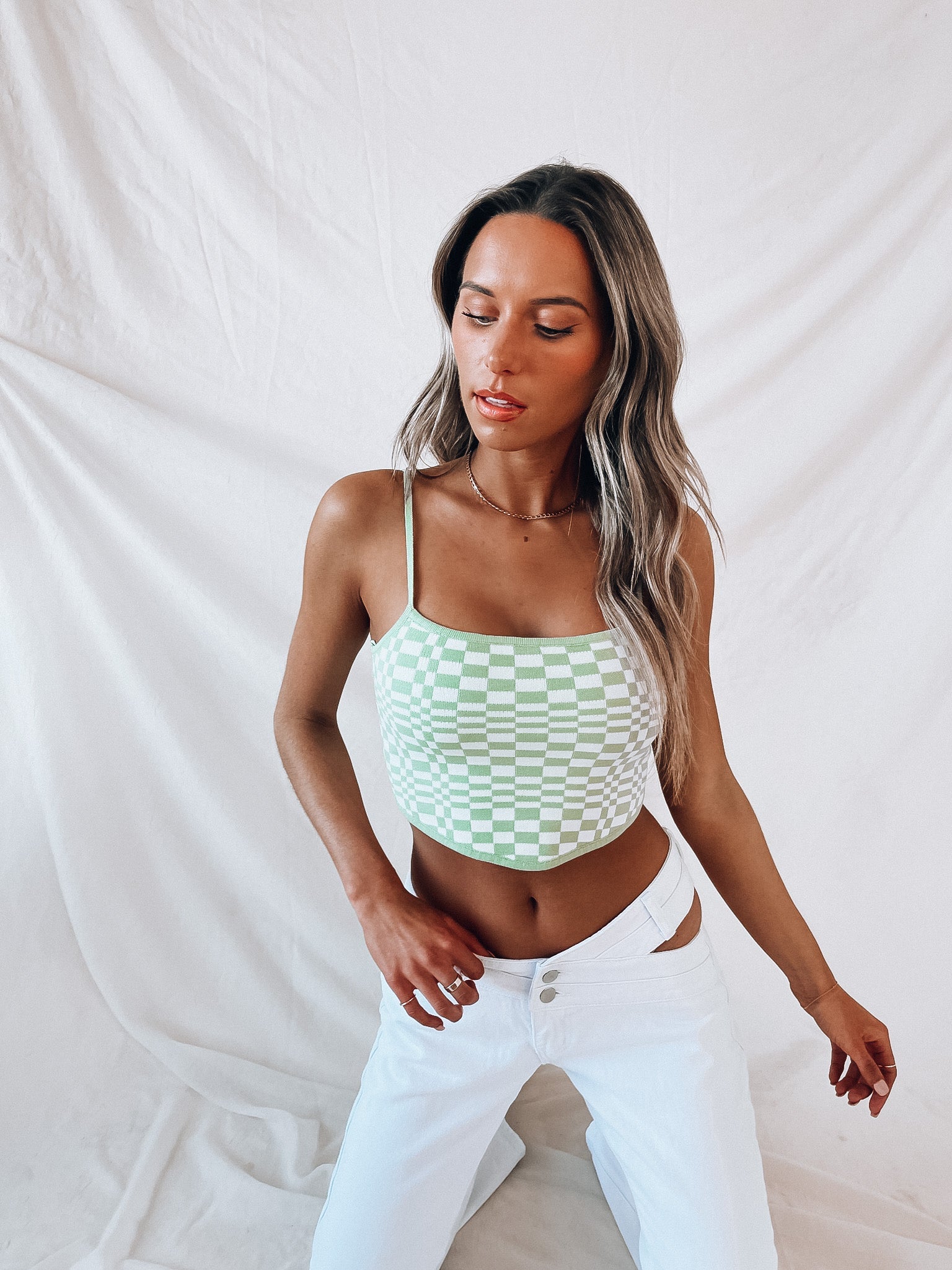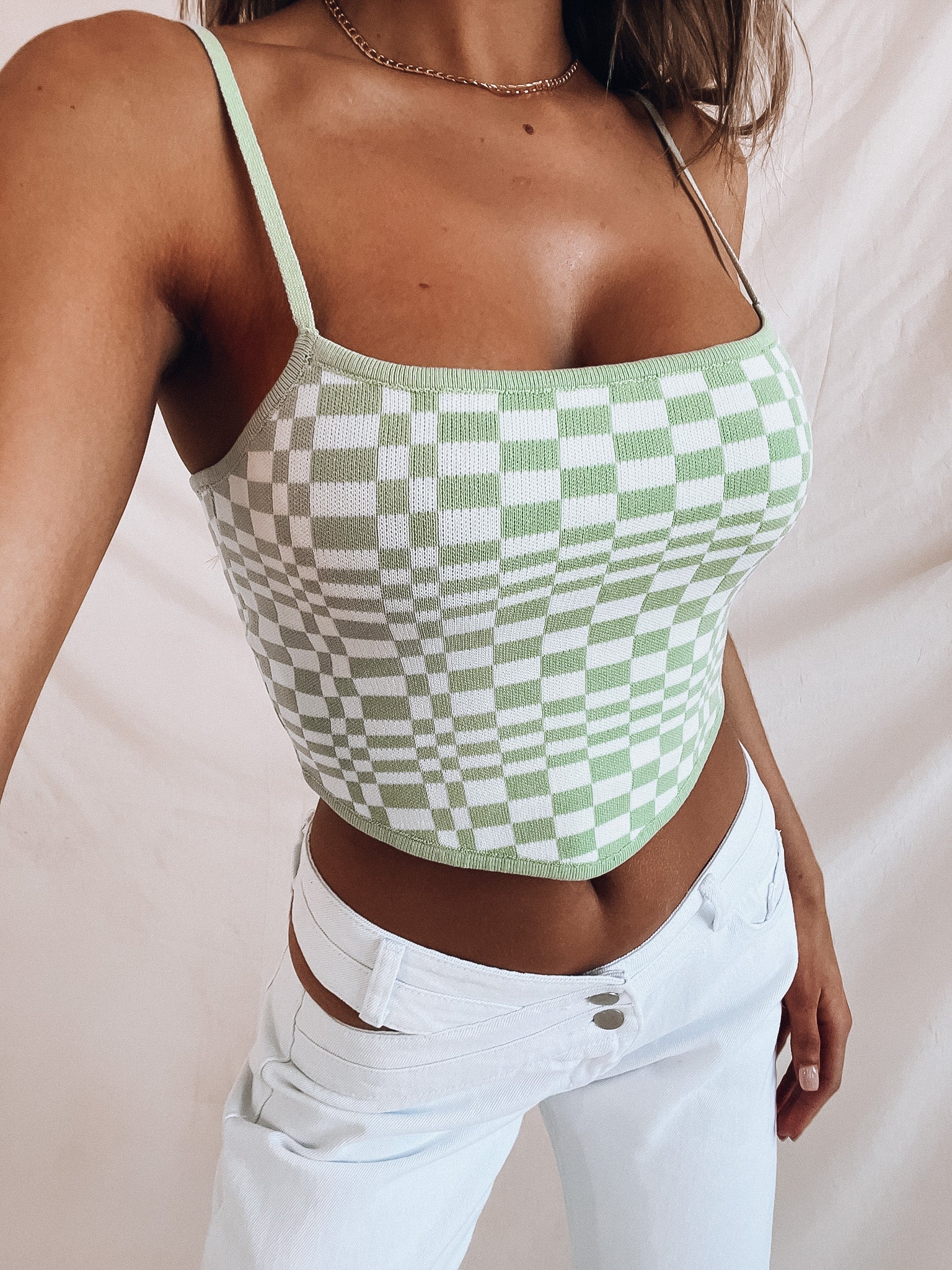 Our Out Of The Box Checkered Crop tank has thin straps and is a fitted crop top. This cute crop has a checkered print sabric and is soft to the touch.