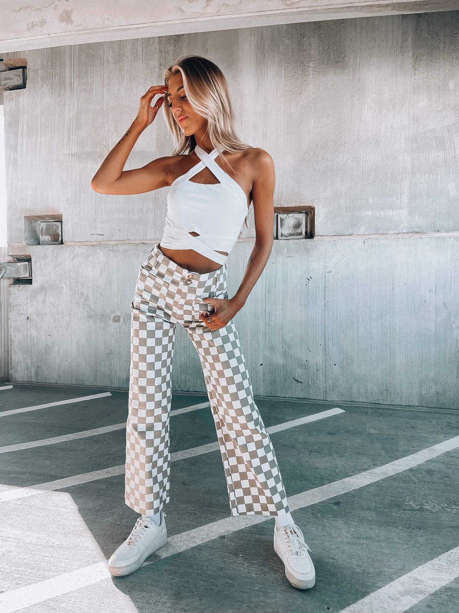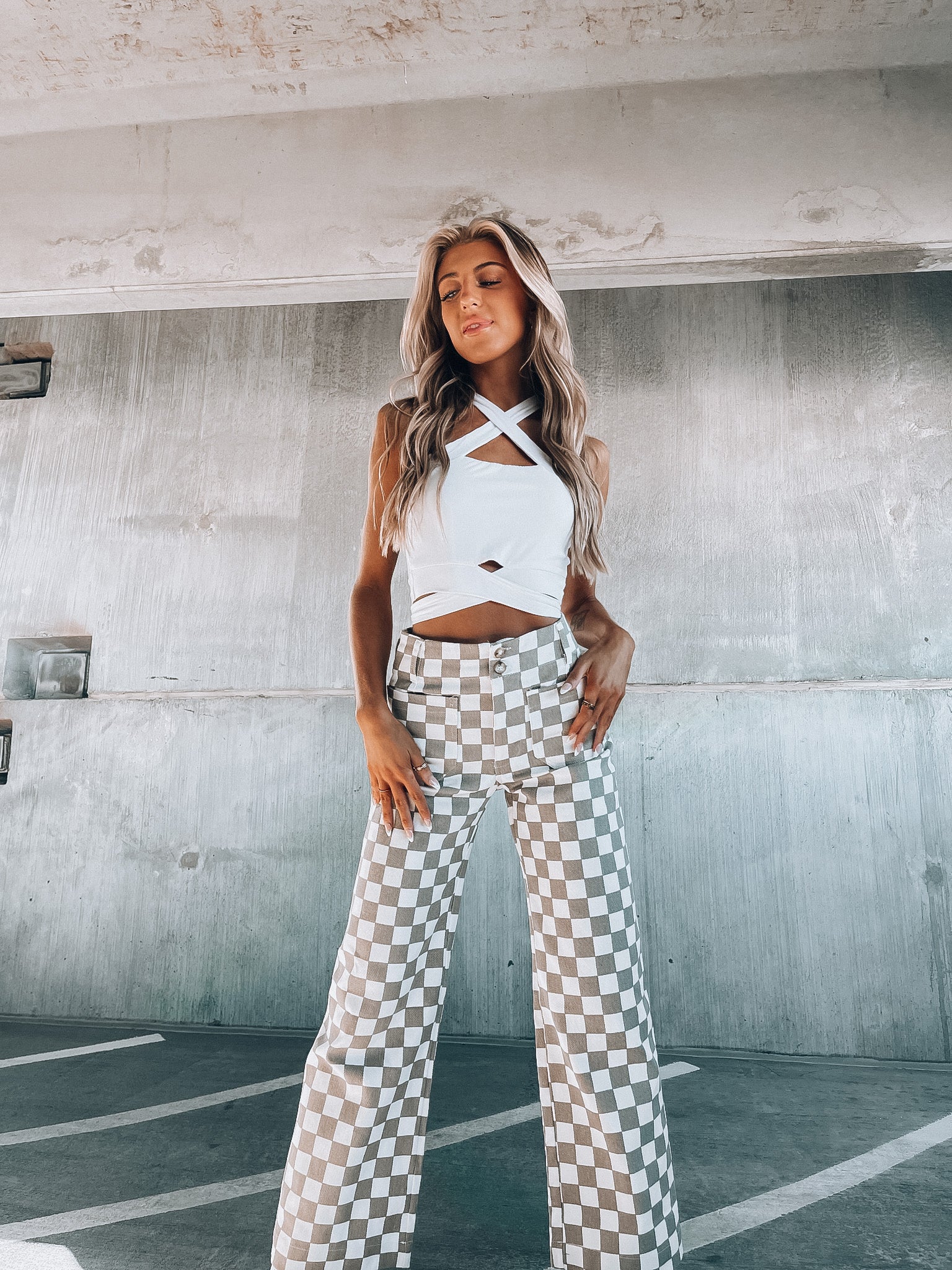 Our Haley Criss Cross Halter Top is a cropped fitted top. There is a self tie wrap around closure. The straps cross around the neck to make that cross look and this top has two little keyholes in the front.