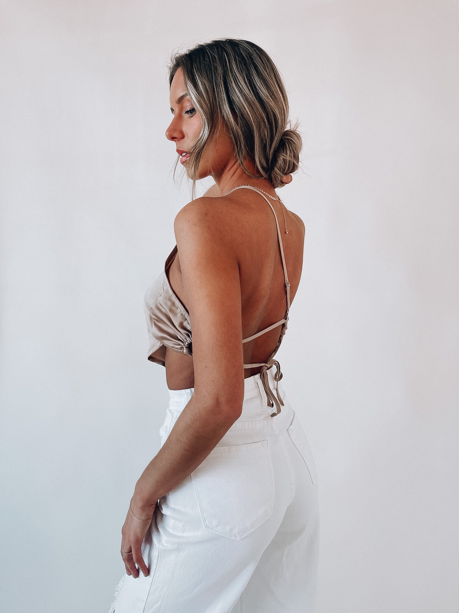 Our Taupe Asymmetrical Satin Top is a lightweight silky fabric with an adjustable strap. This top also has a string tie closure on the back to make a keyhole detail.