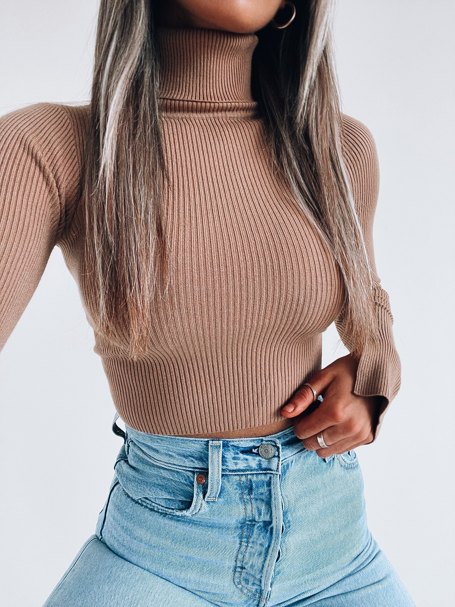 Our Veyda Ribbed Tan Turtleneck is a fitted long sleeve. The sleeves have little slits where it hits the wrist. This top is also a cropped fit.
