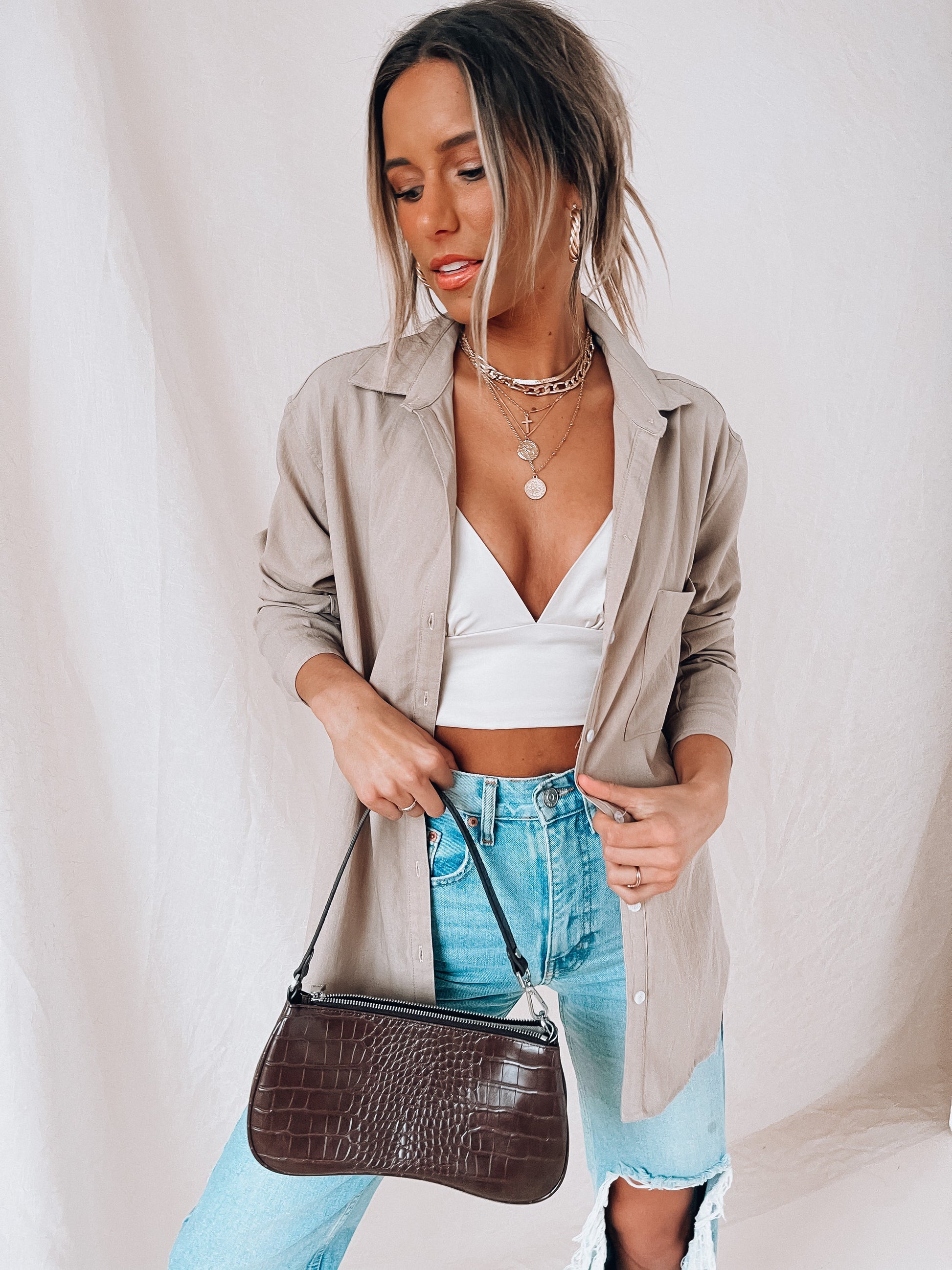 Our Sandy Button Up is a lightweight overpiece. This top has a buttondown closure with a front patch pocket. The sleeves can be rolled up and buttoned at the elbow. This Collared top has a sheen shine to it.