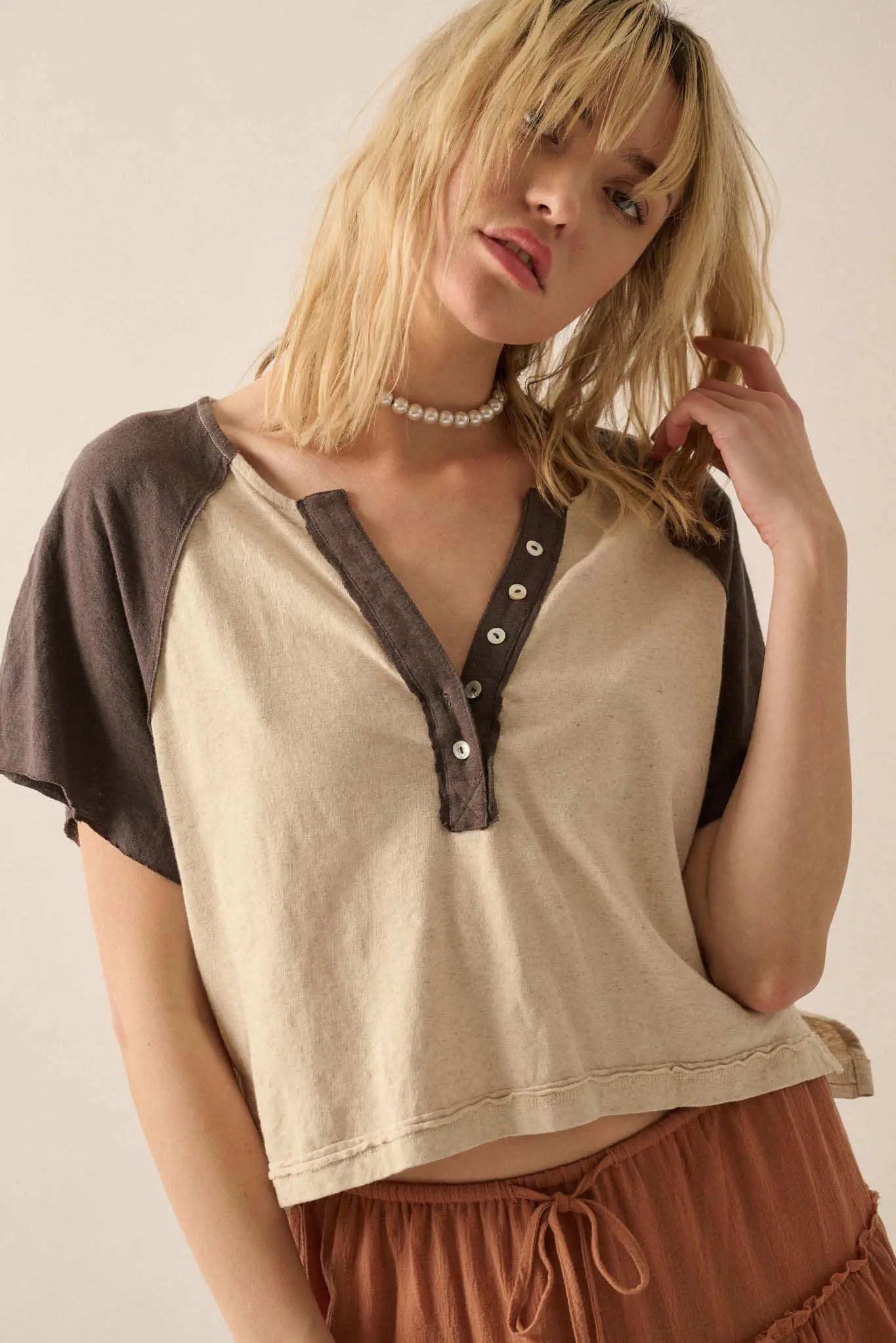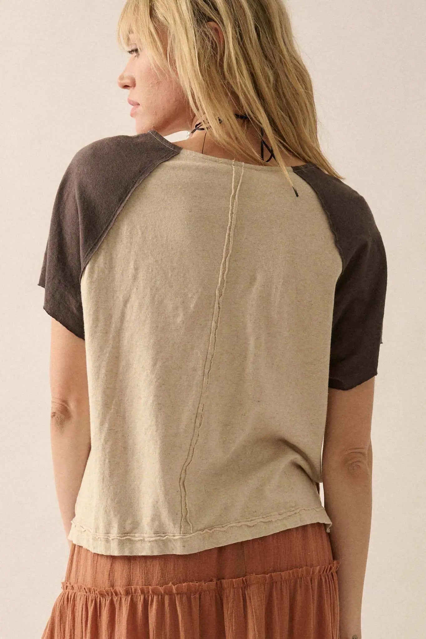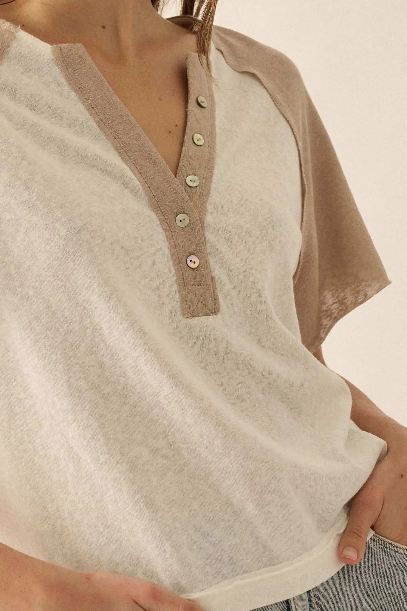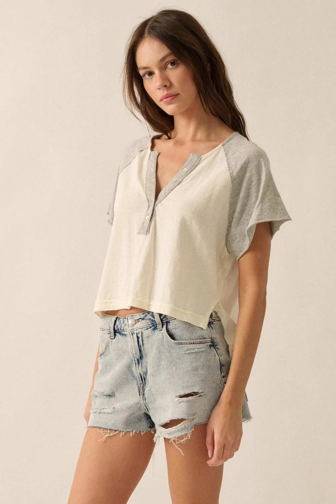Easy Fit Cropped Raw-Edge Henley Raglan Tee