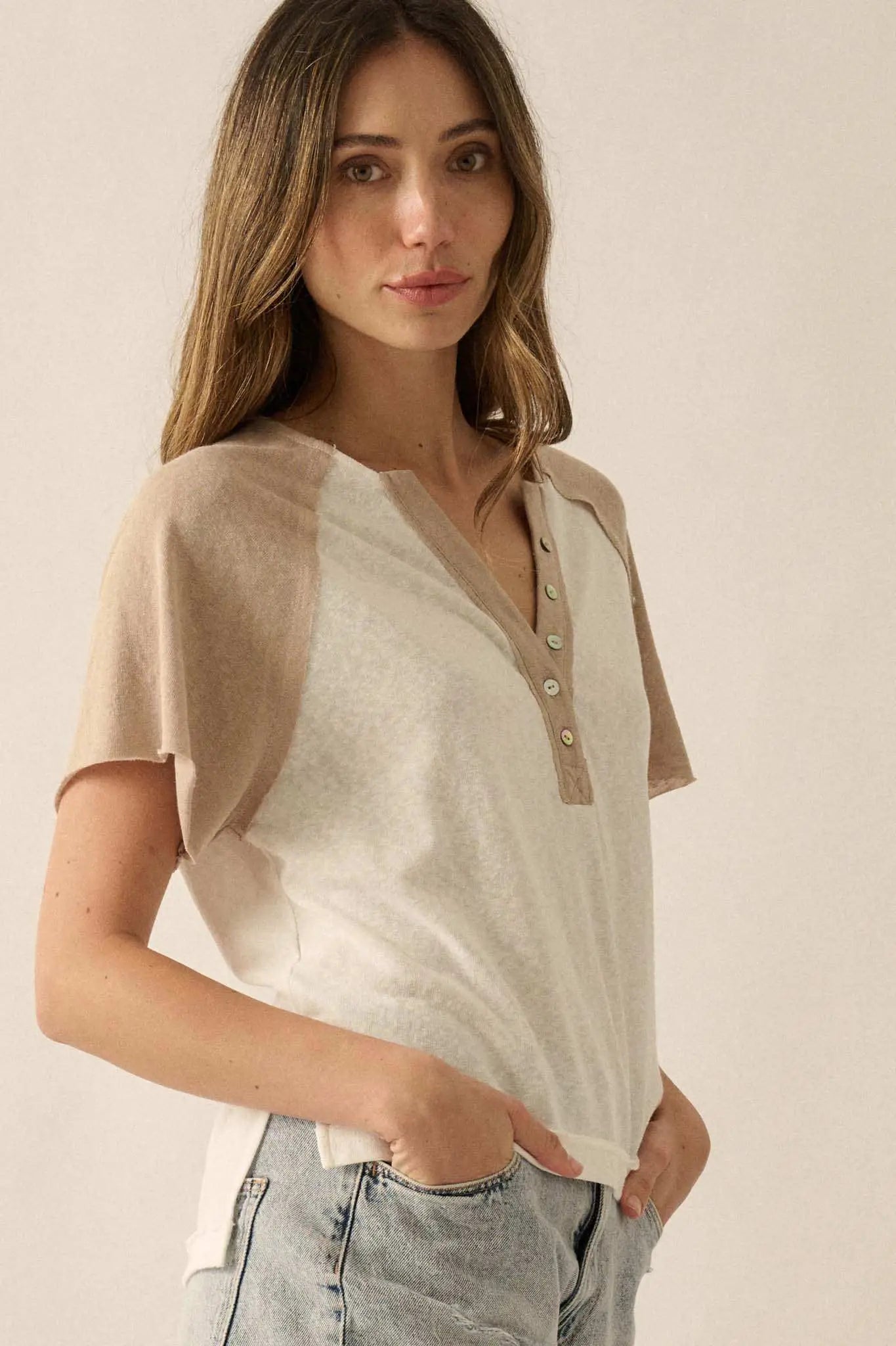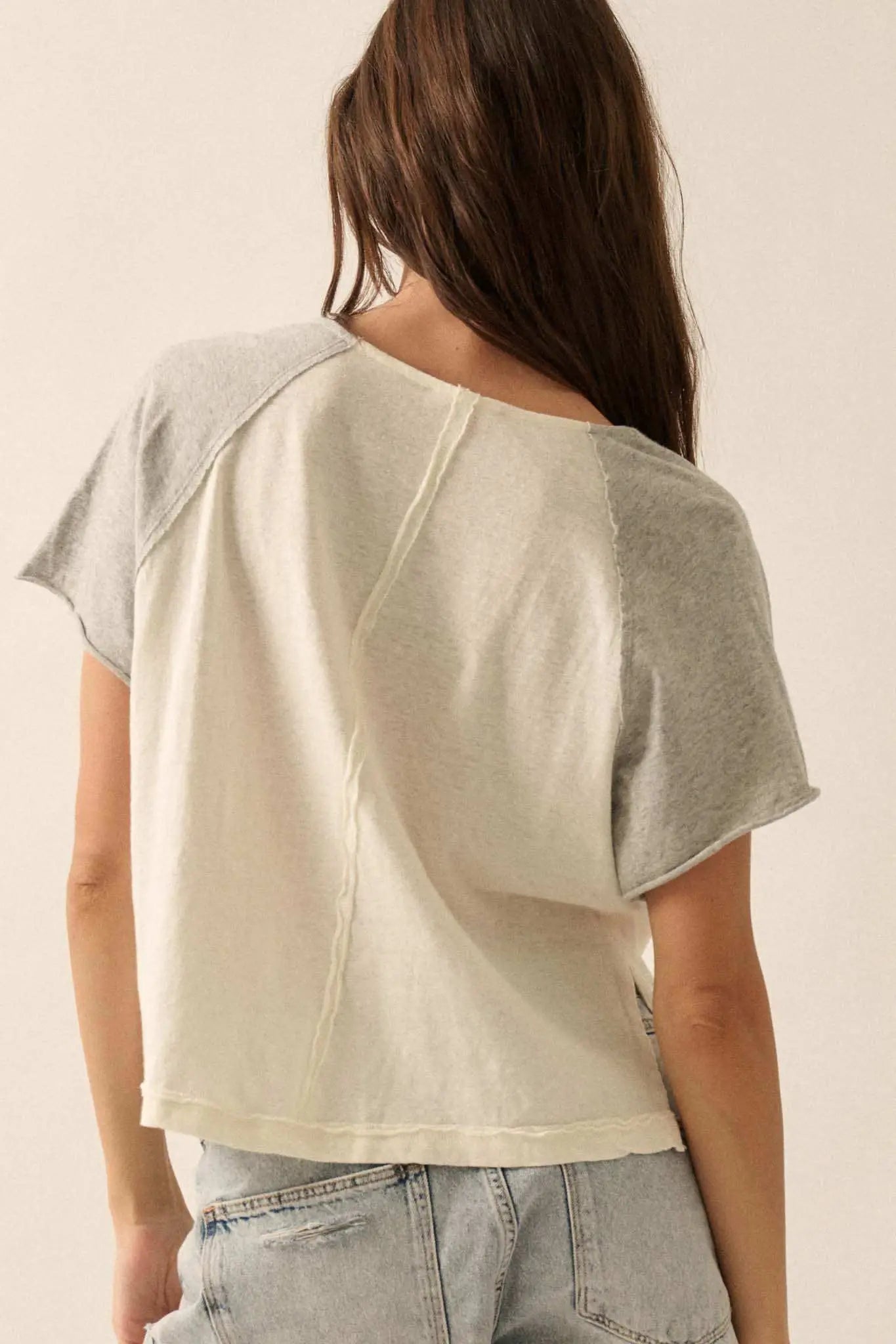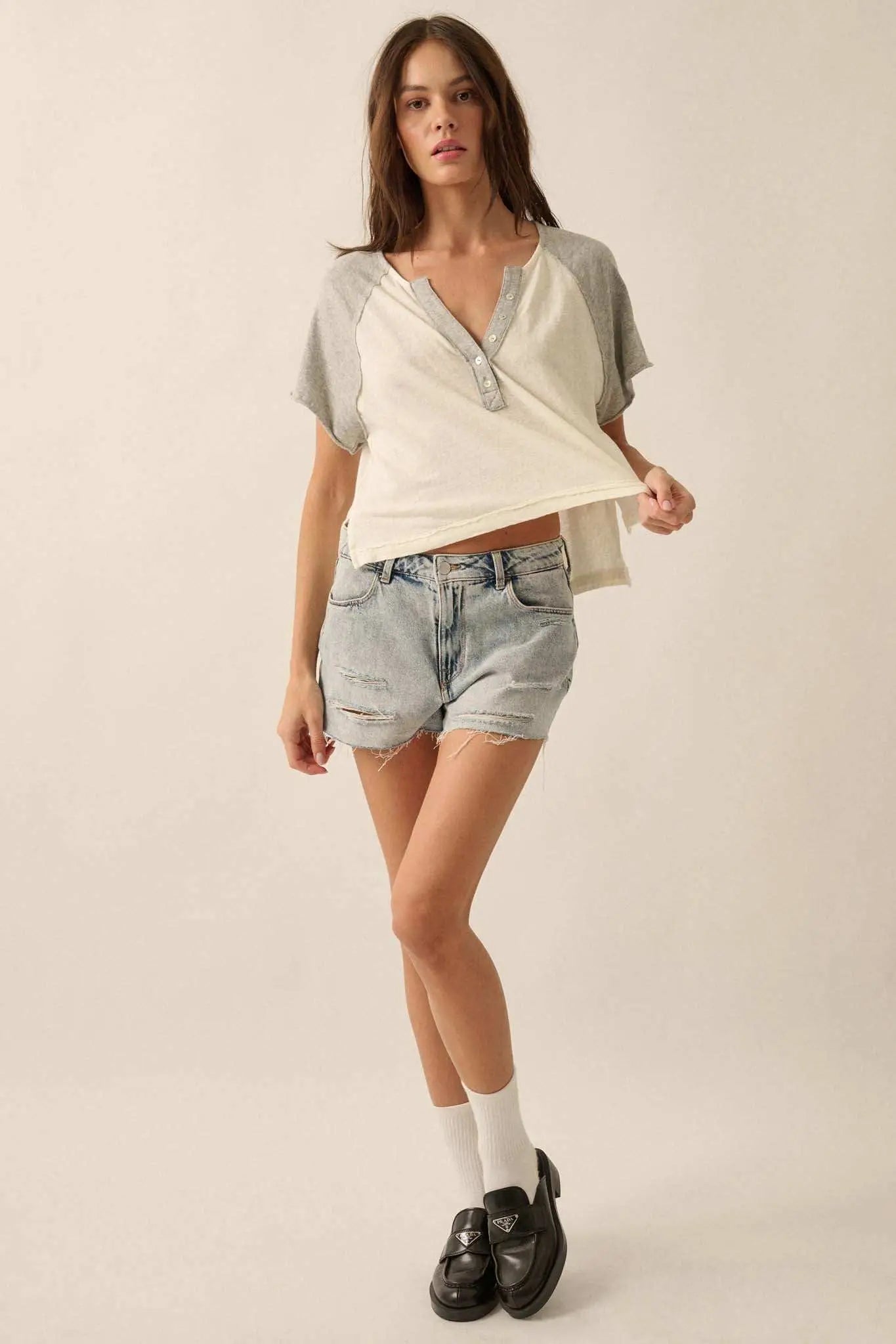 Easy Fit Cropped Raw-Edge Henley Raglan Tee