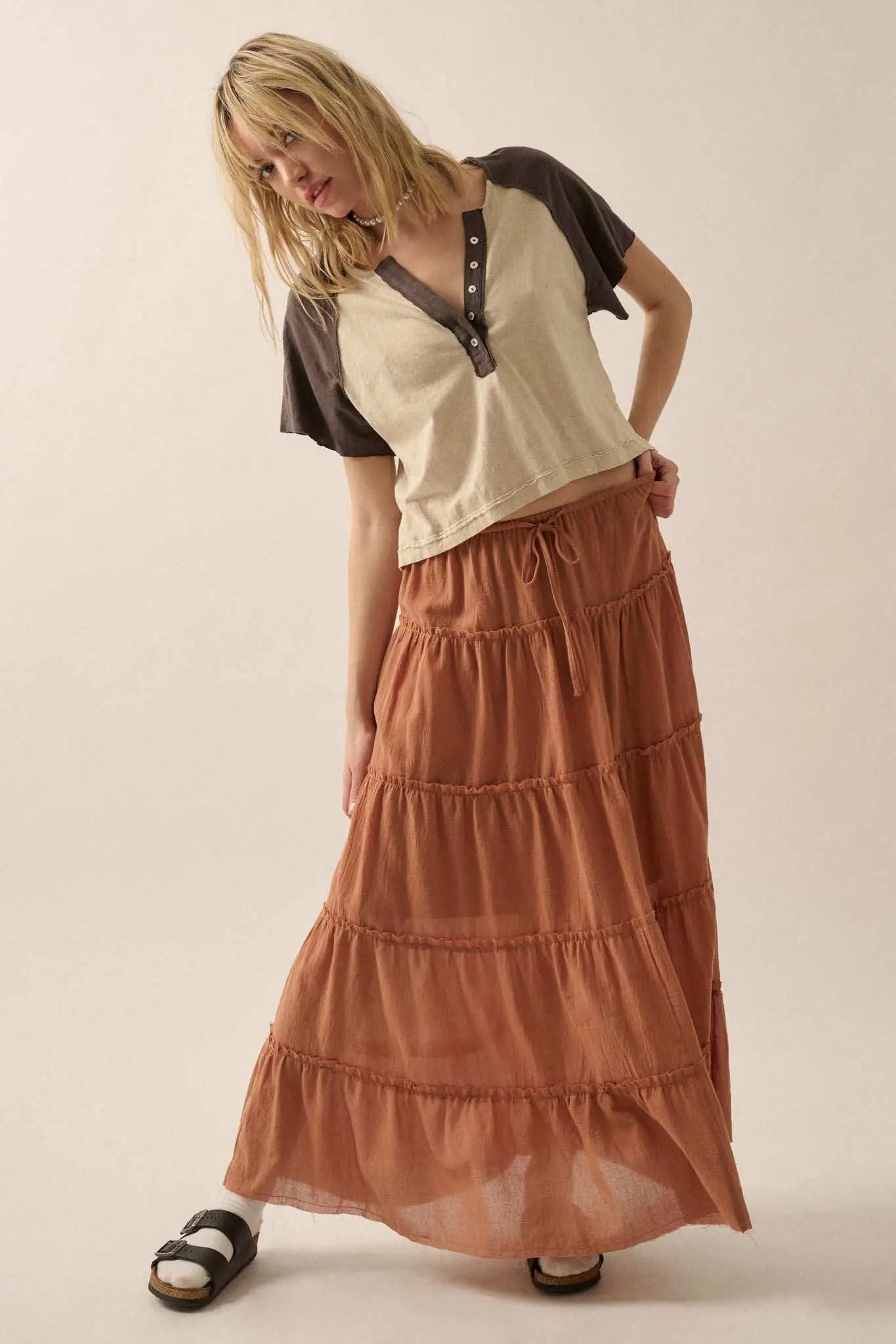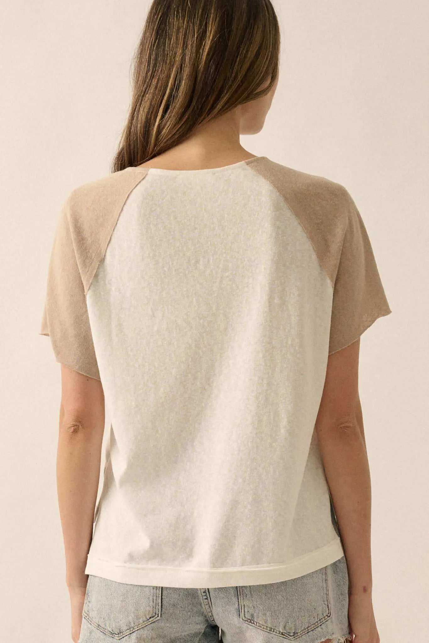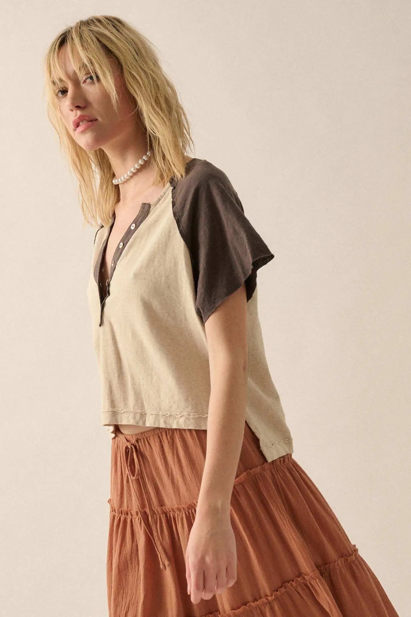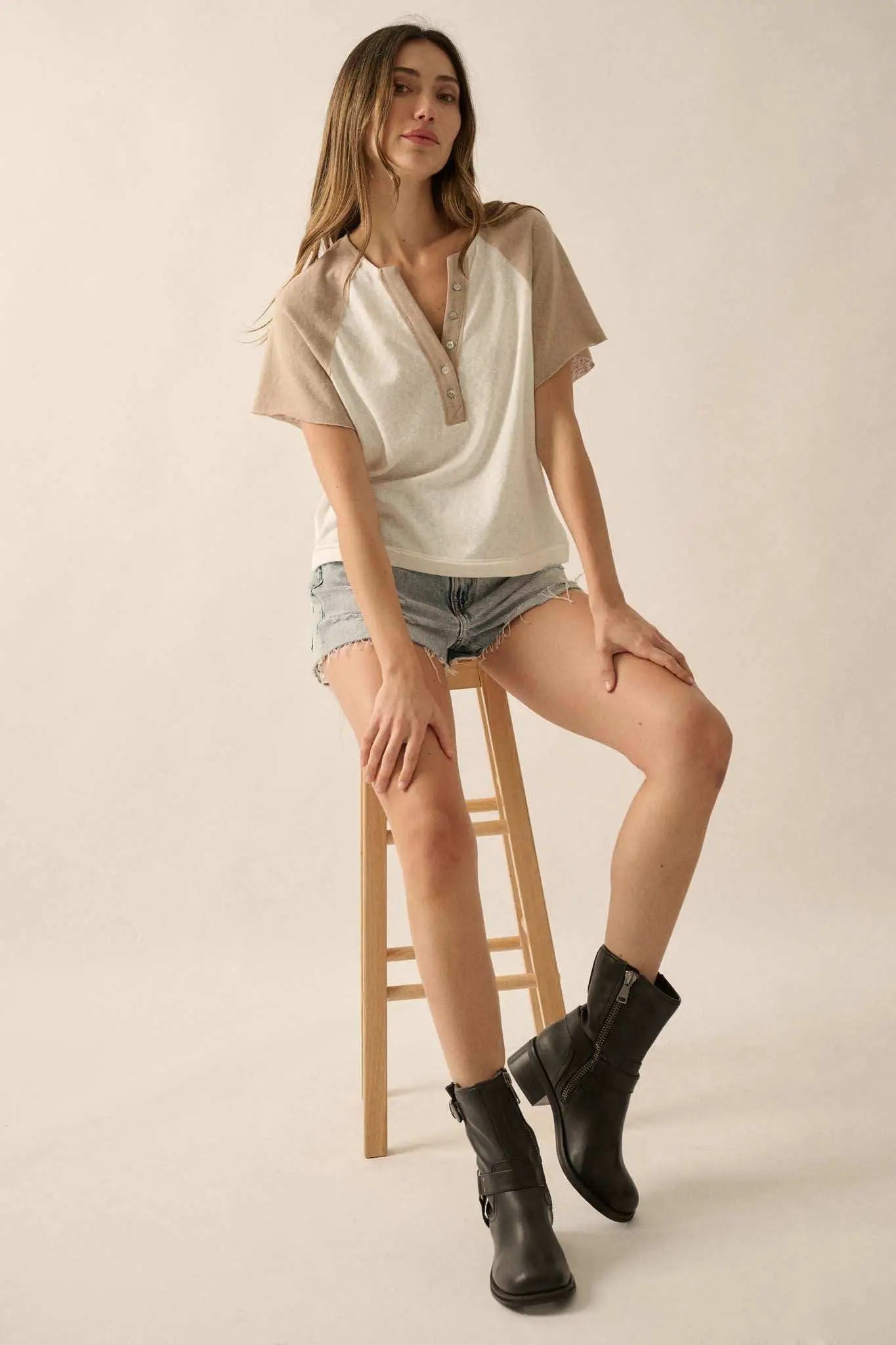 Easy Fit Cropped Raw-Edge Henley Raglan Tee