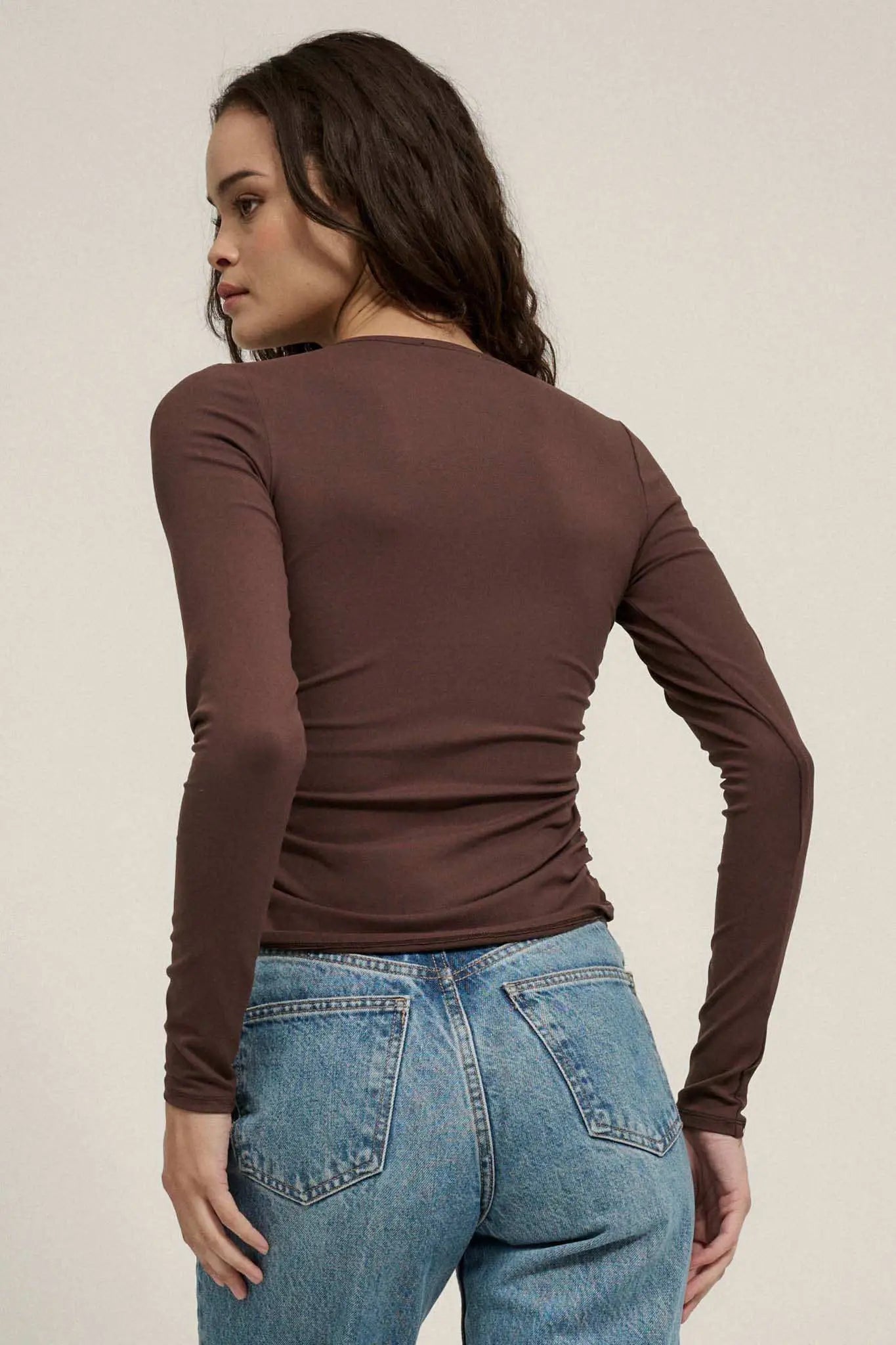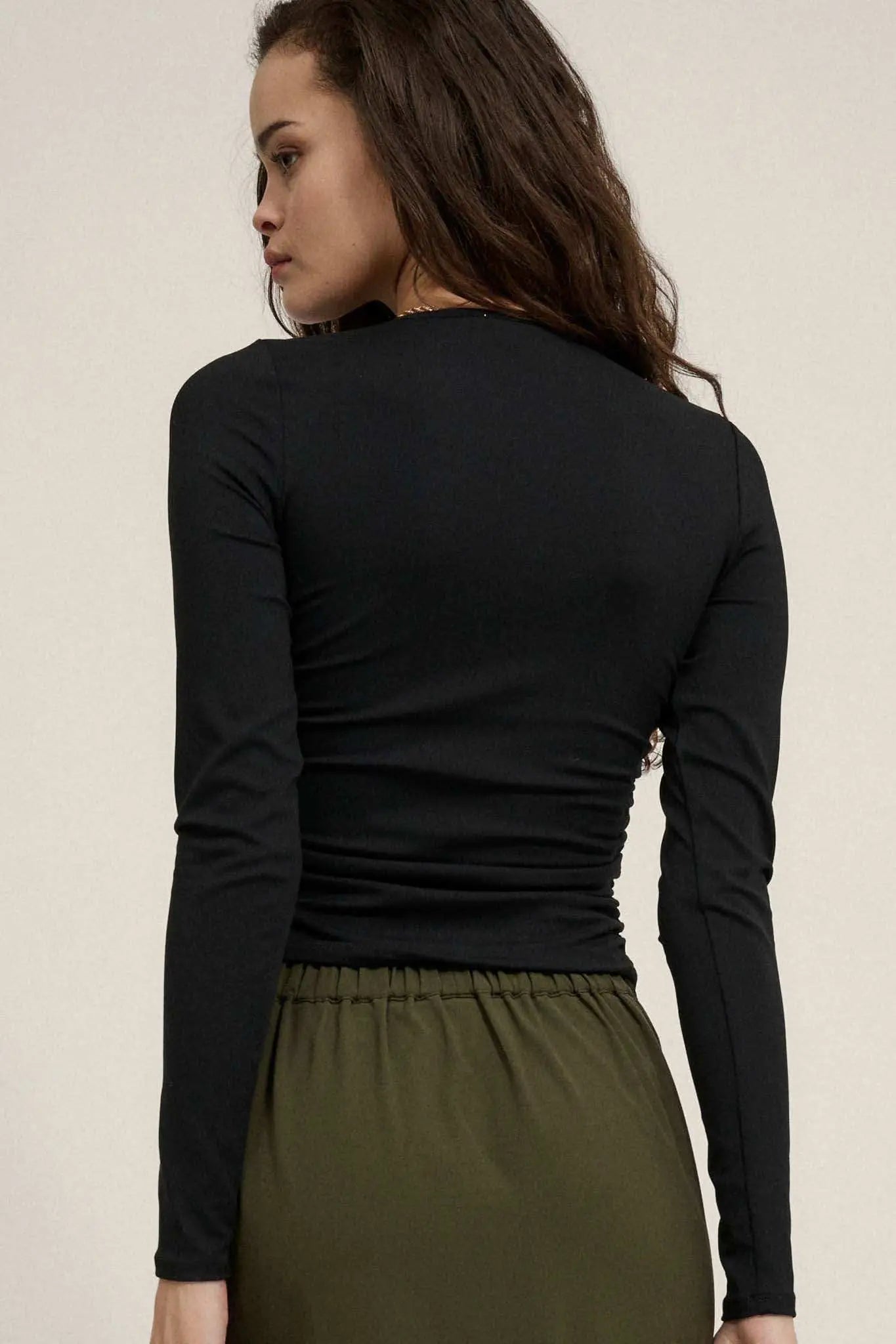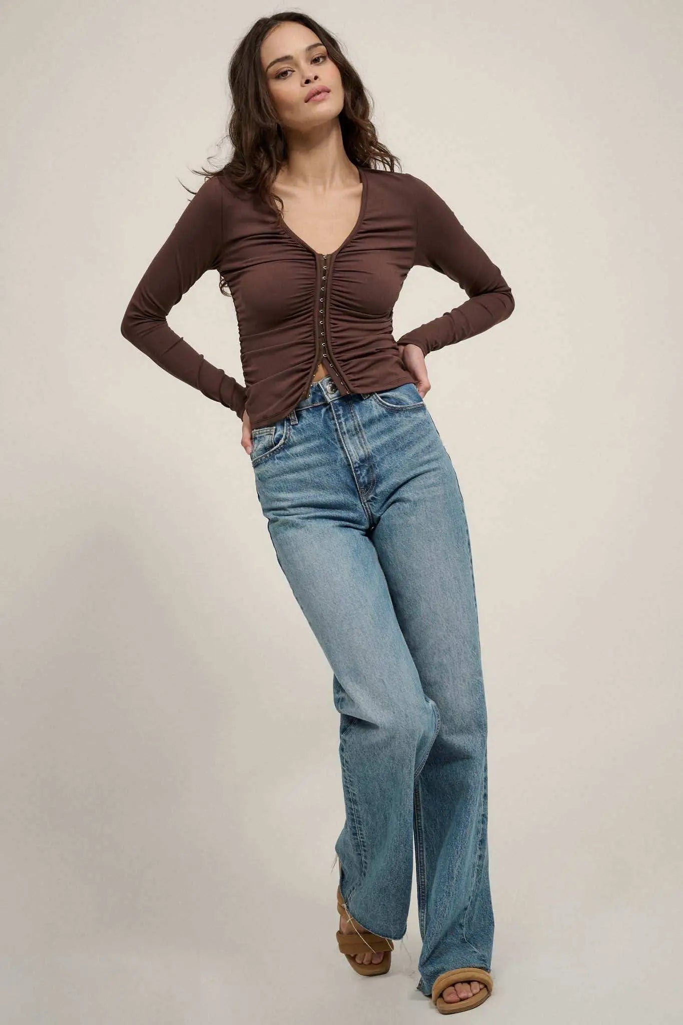 Lifted Fit Ruched Hook-Front Long-Sleeve Top