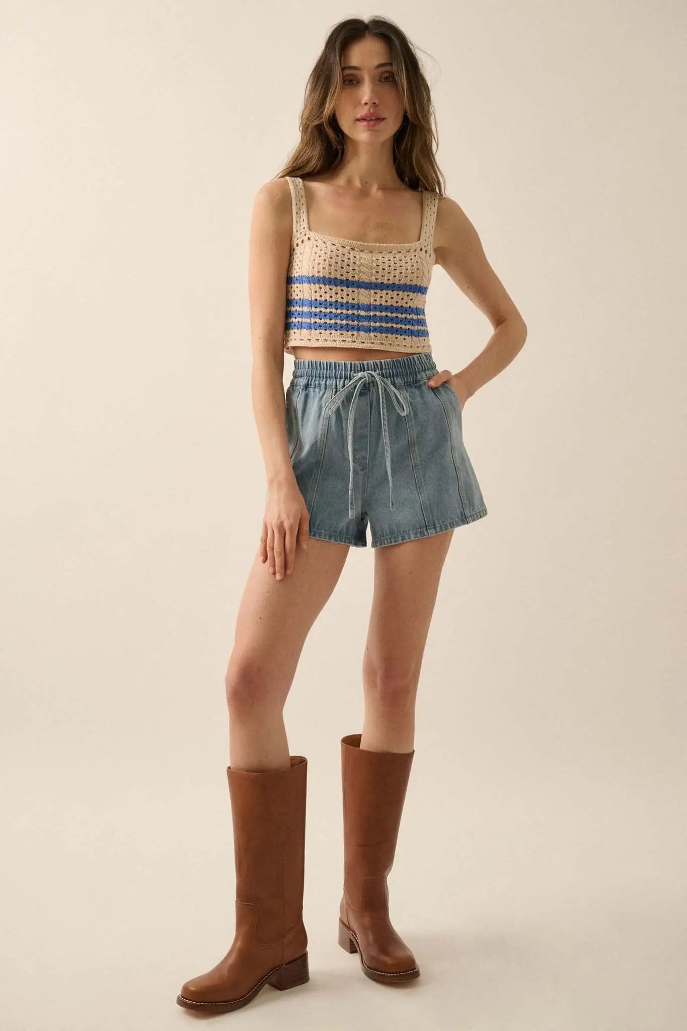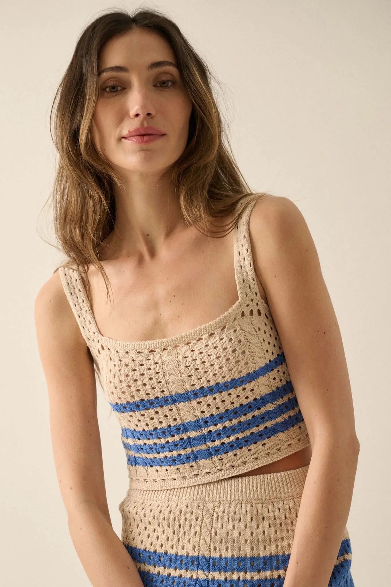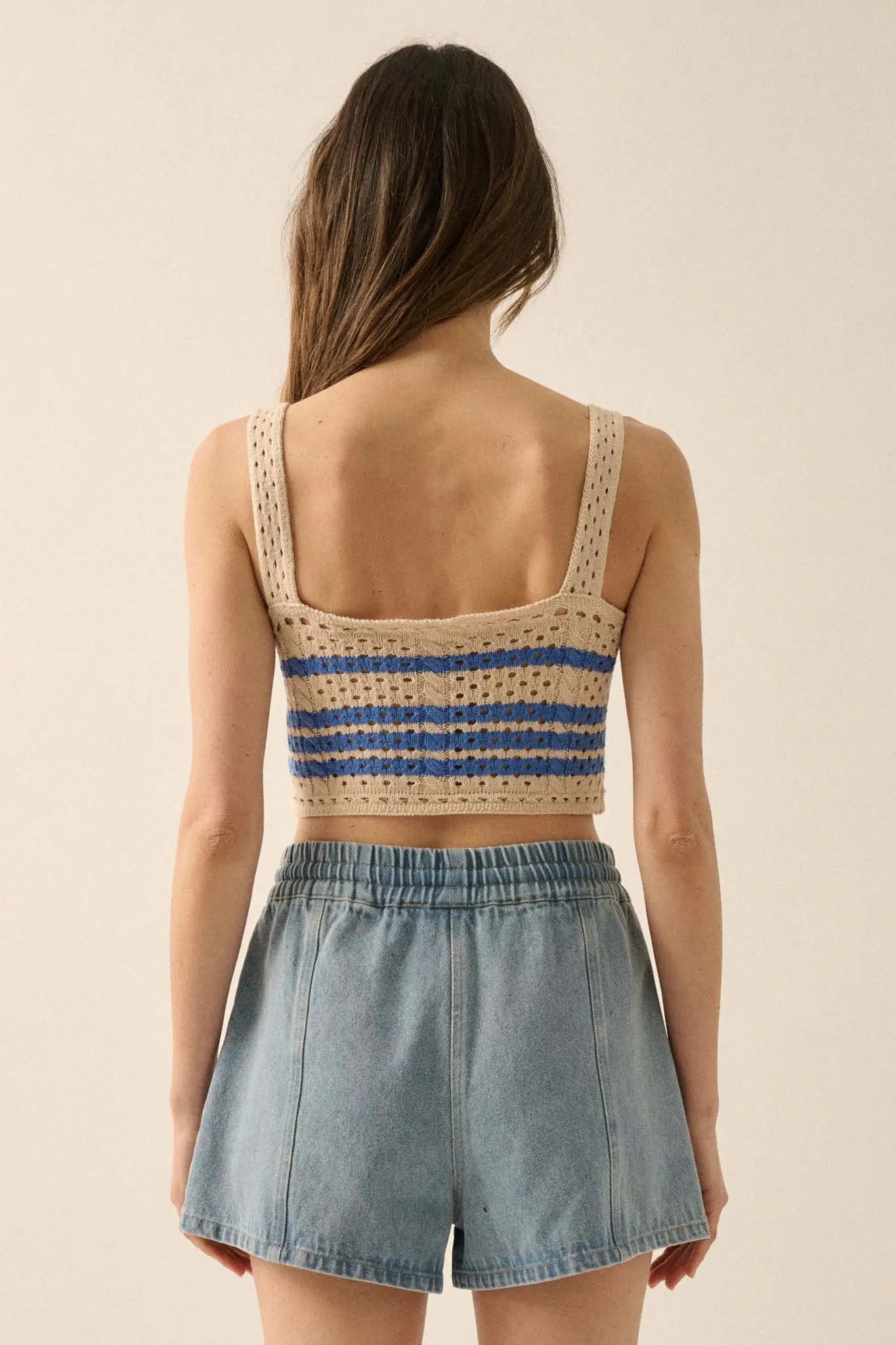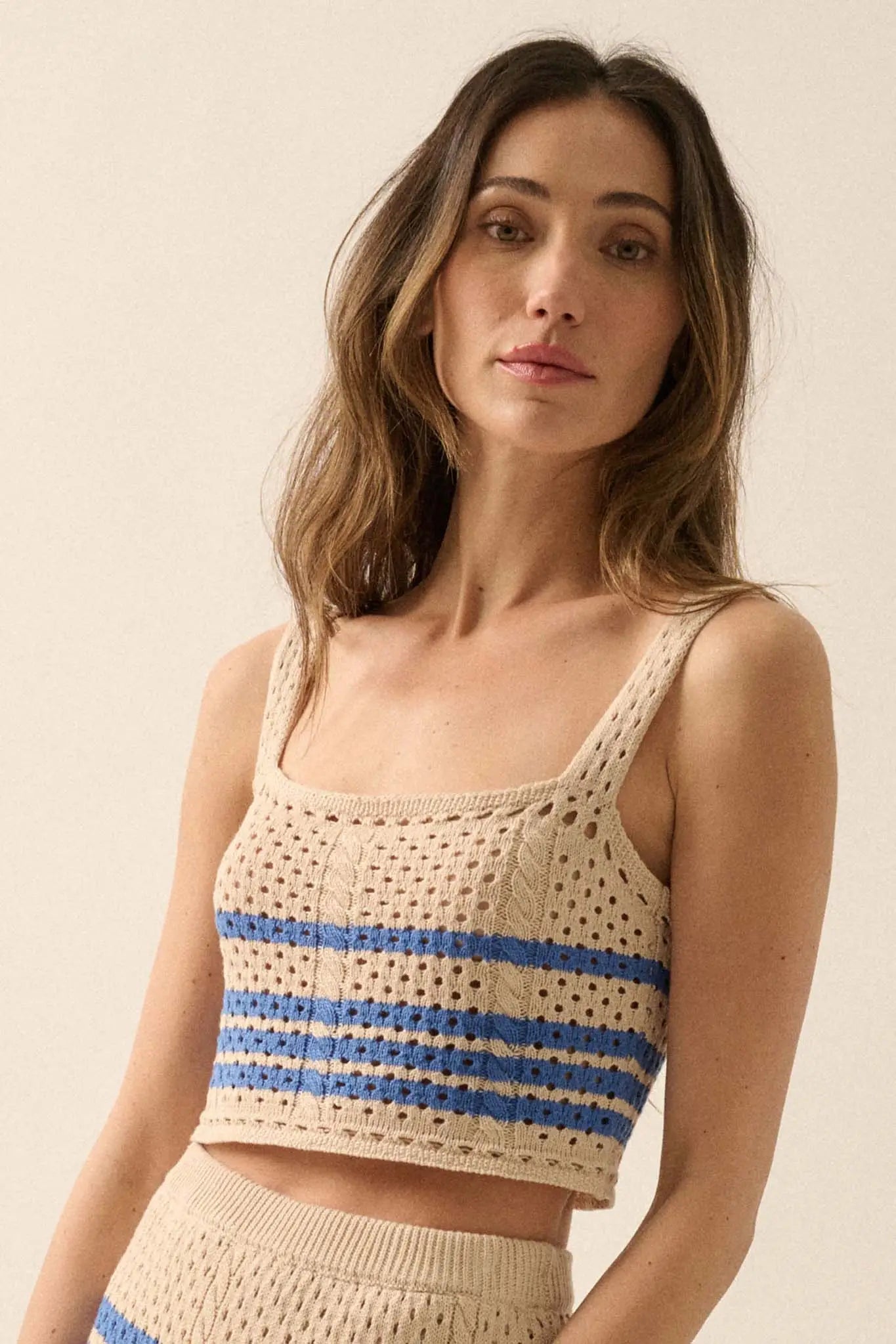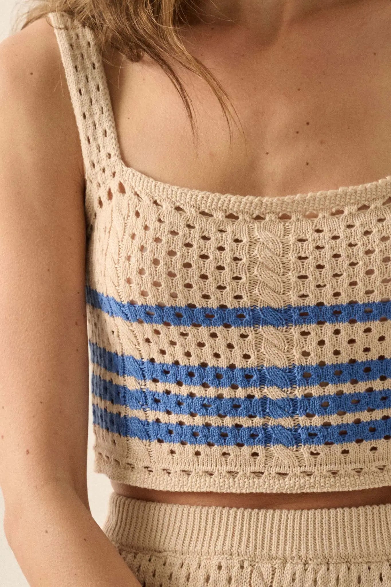 • Striped crochet knit tank top.