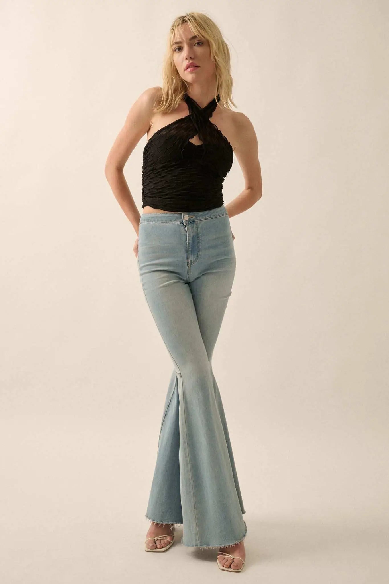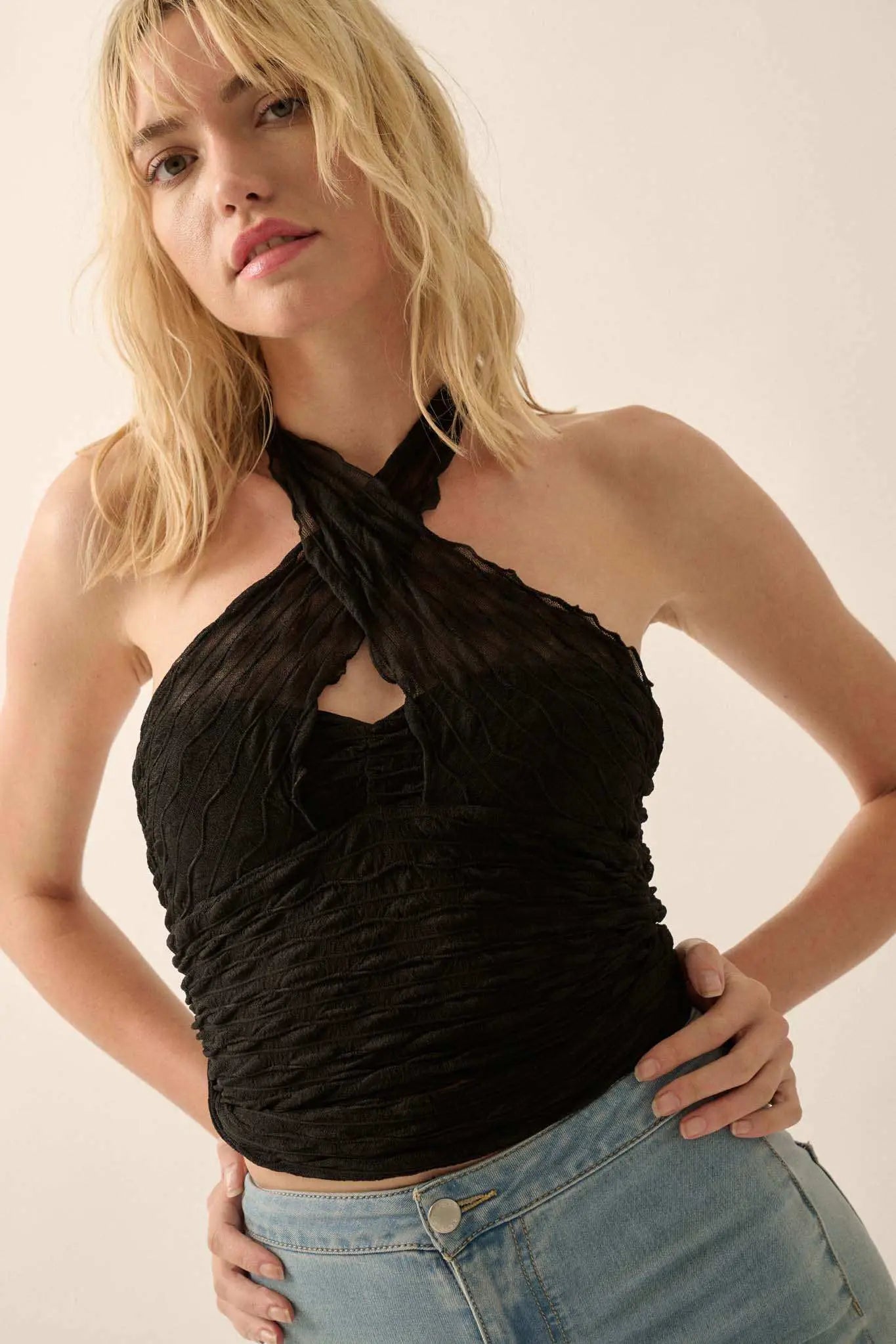 Shock Wave Ruched Mesh Cross-Front Wrap Halter Top