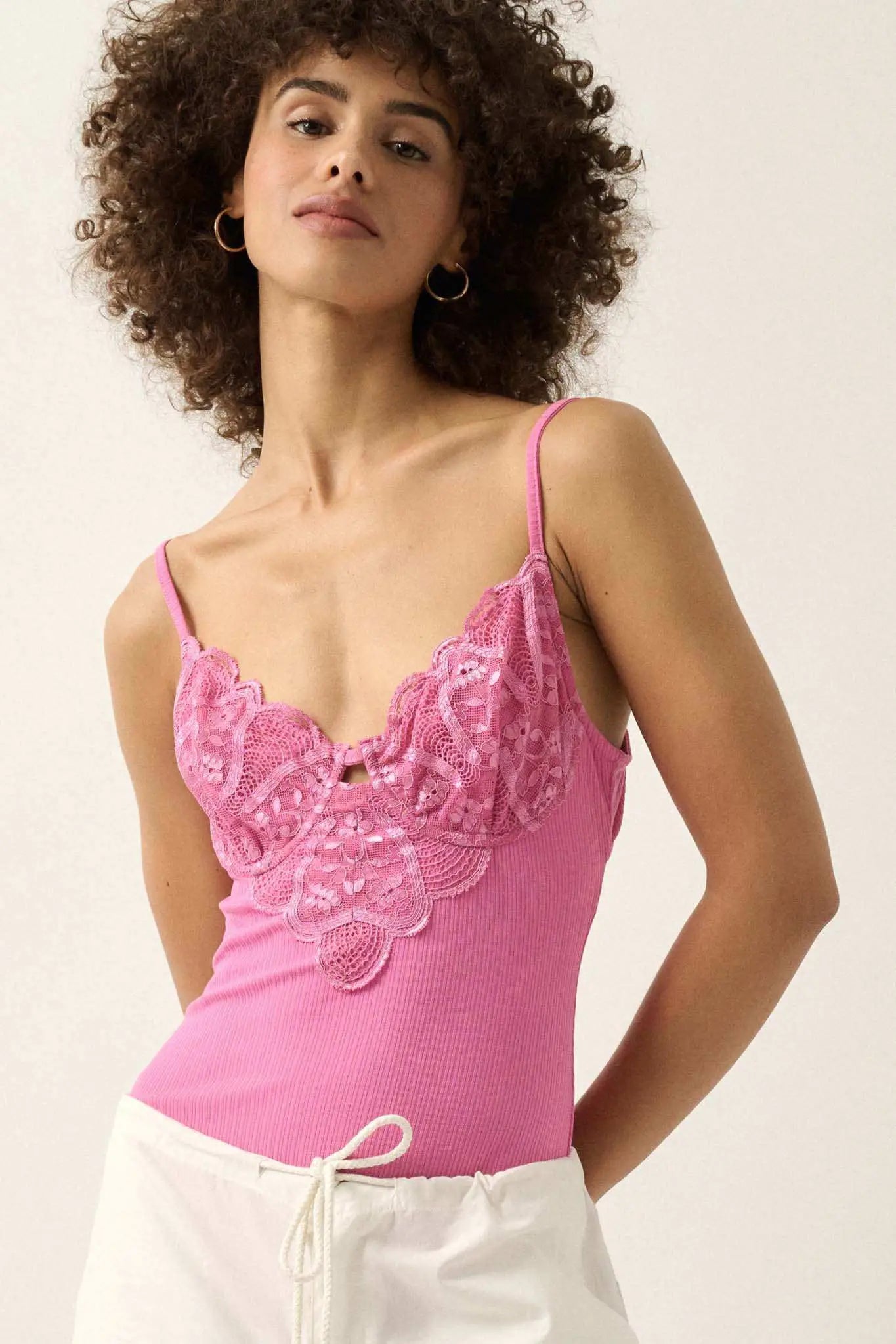 • Lace underwire cups with keyhole.