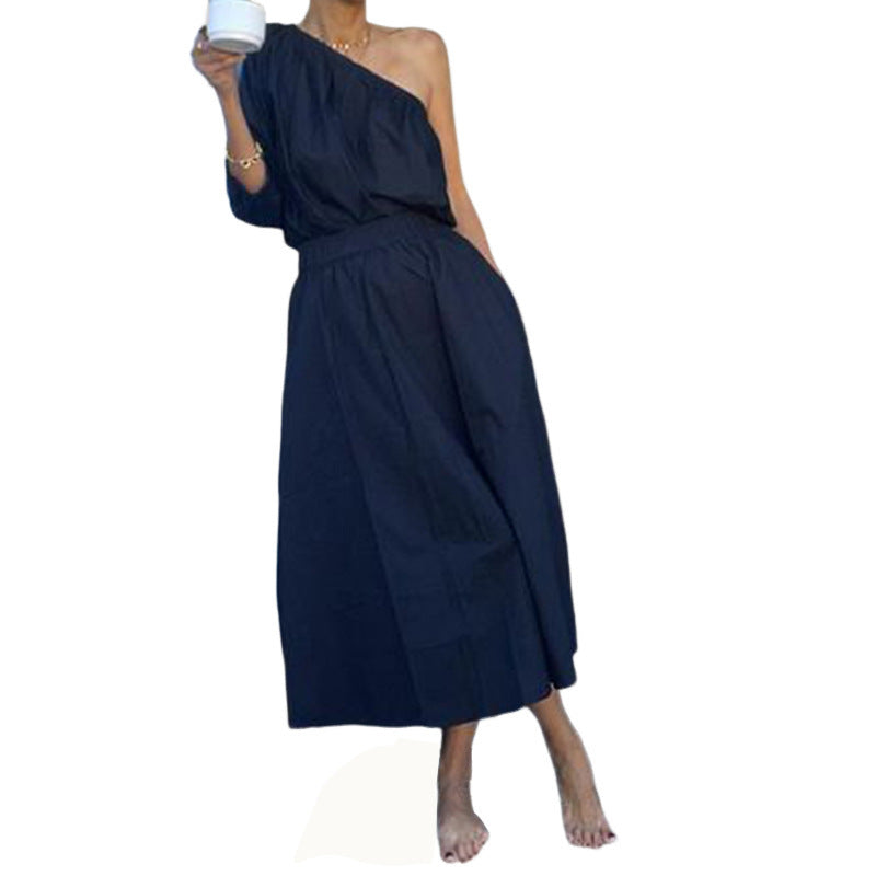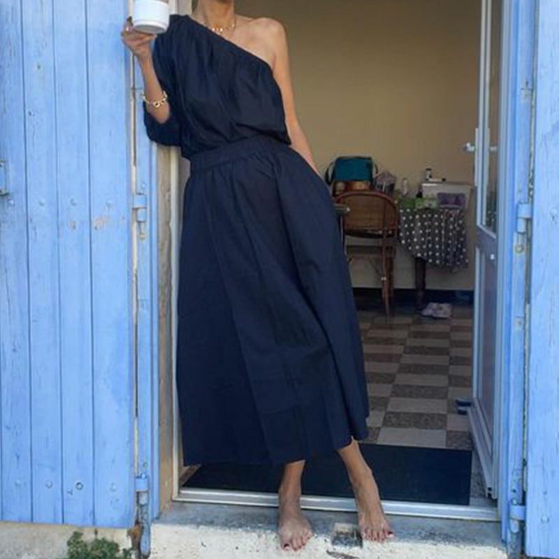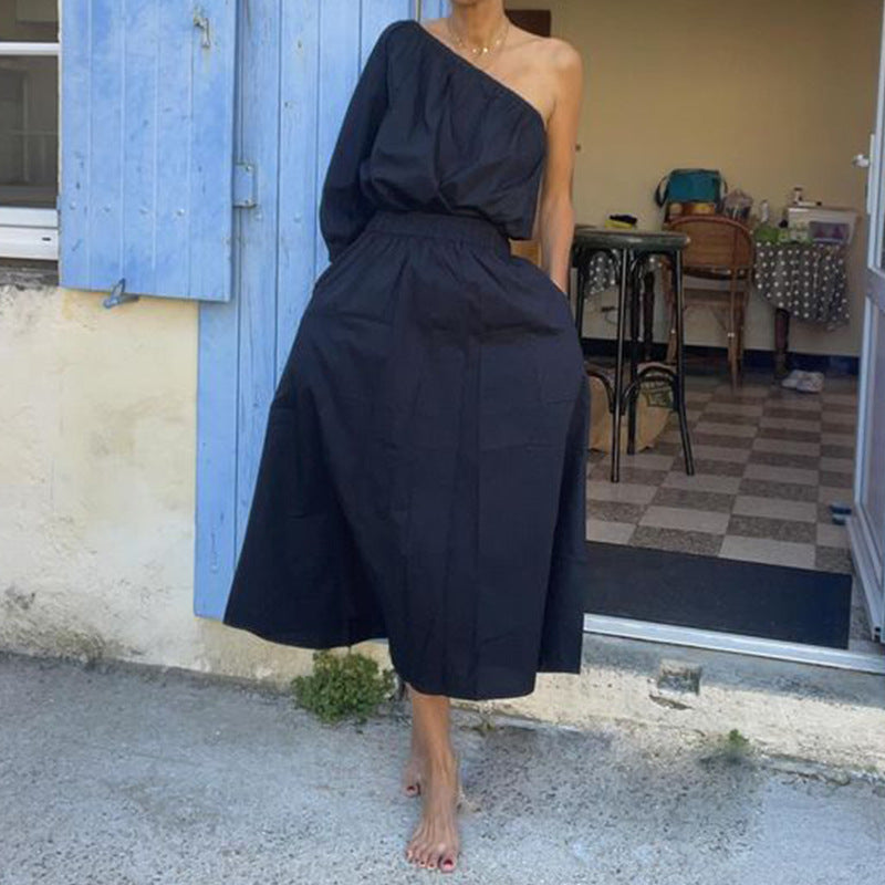 Oblique Shoulder Tops Mid-length Skirt Suit Two-piece Set