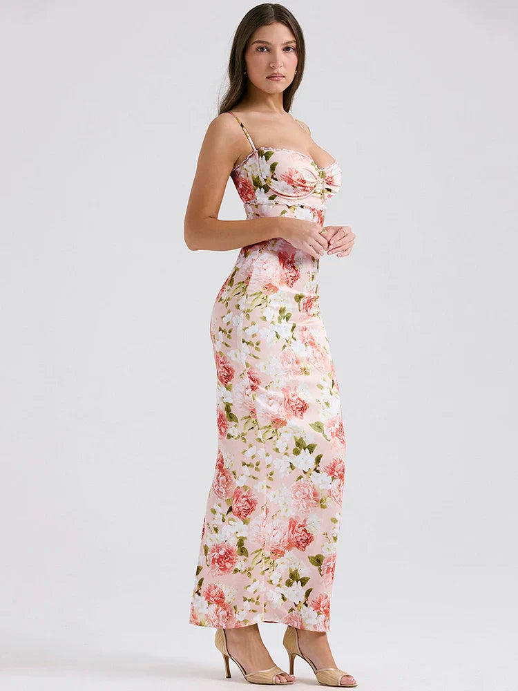 Spaghetti Strap Sleeveless Backless Bodycon Back Split Maxi Floral Dress